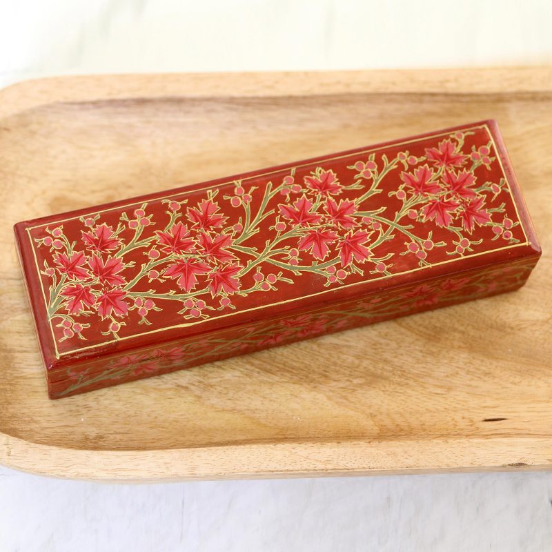 Elevate your office space with Fida Hussain's beautiful papier mache pencil box. The Indian artisan hand crafts the rectangular box from weeping willing wood, pasting strips of paper around the box before buffing the surface smooth. Finally, the box is hand painted in a lovely leaf motif, then given a coat of glossy lacquer for shine and protection.