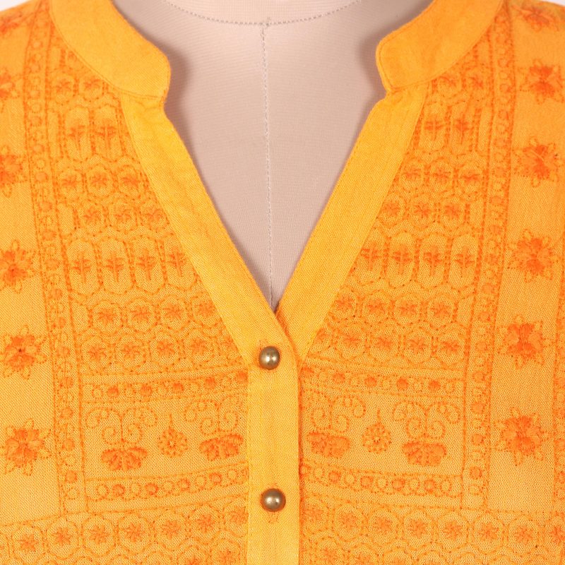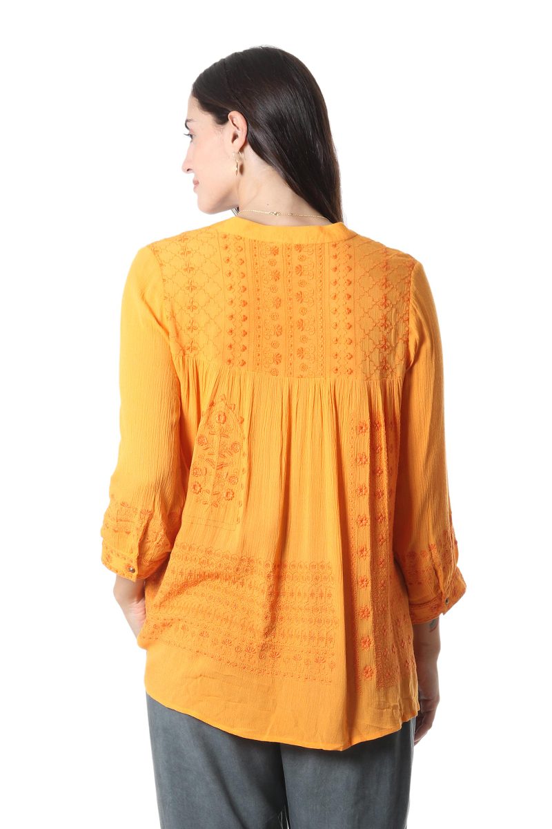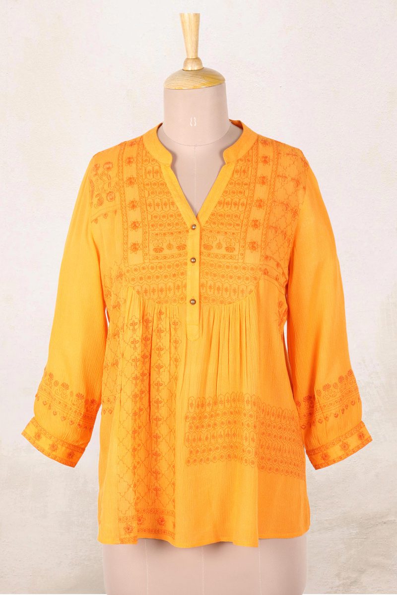 Lavish tonal embroidery brings a cheerful beauty to this marigold-orange tunic. By Anchal Ahuja, the smock-style blouse features a button placket and cuffs, and three-quarter length sleeves in an easy-to-wear, easy-to-care design.
