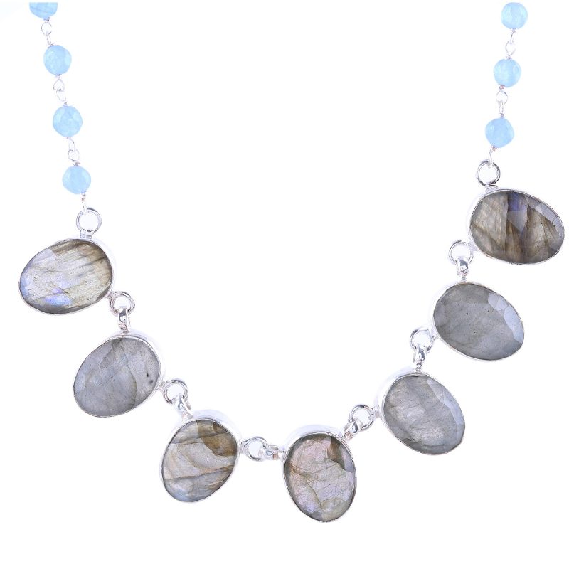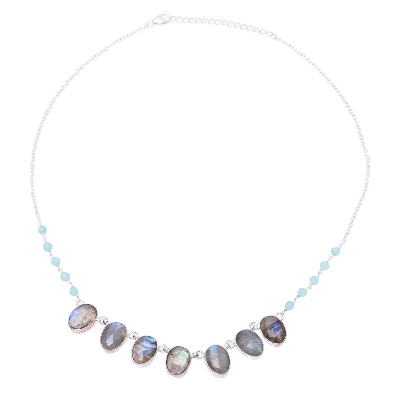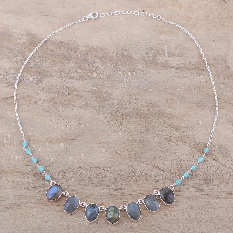 Neetu Barathi of India designs this lovely pendant necklace with the enchanting colors of a stormy sky. Connected by sterling silver links, a row of seven faceted labradorite ovals hang between two sets of chalcedony beads dyed a beautiful sky blue. The necklace has a sterling silver cable chain with an extender to easily adjust the length.