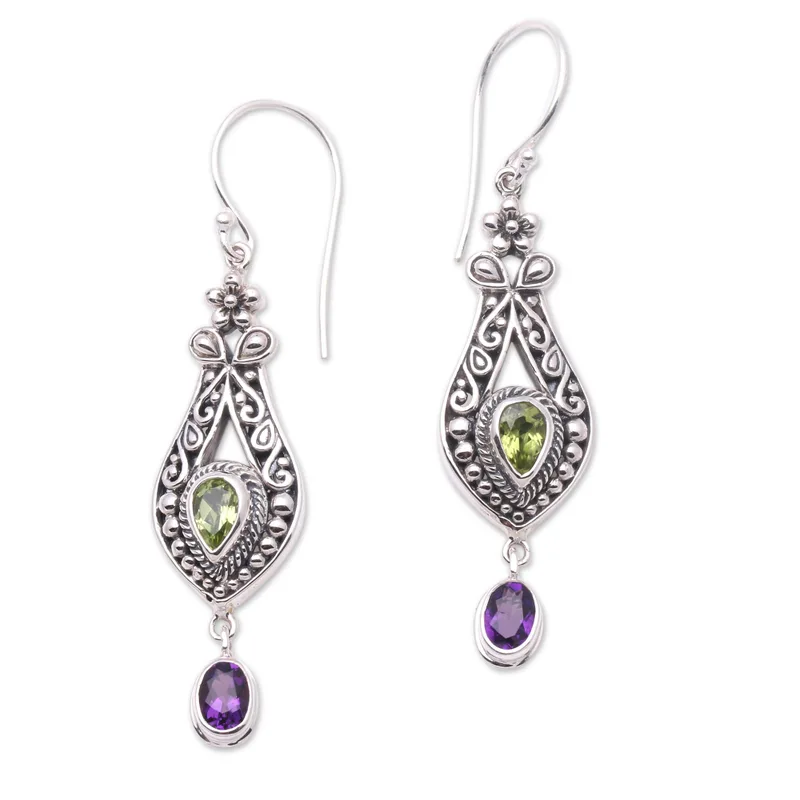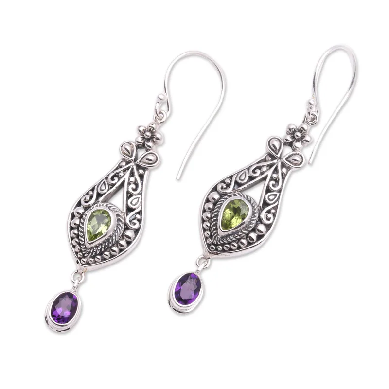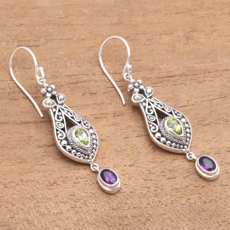 Celebrating the distinct beauty of peridot and amethyst, Balinese artisan Made Sugi creates these dangle earrings. Two teardrops of peridot glitter from within combination-finish patterns in sterling silver, from which amethyst ovals dangle.