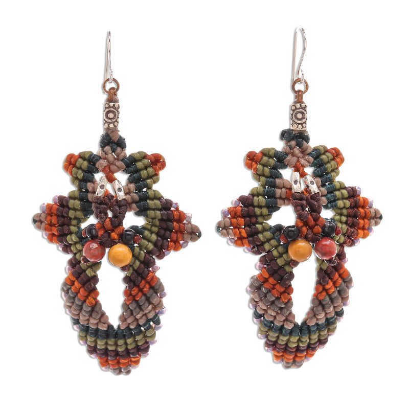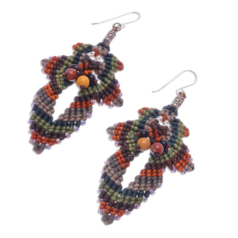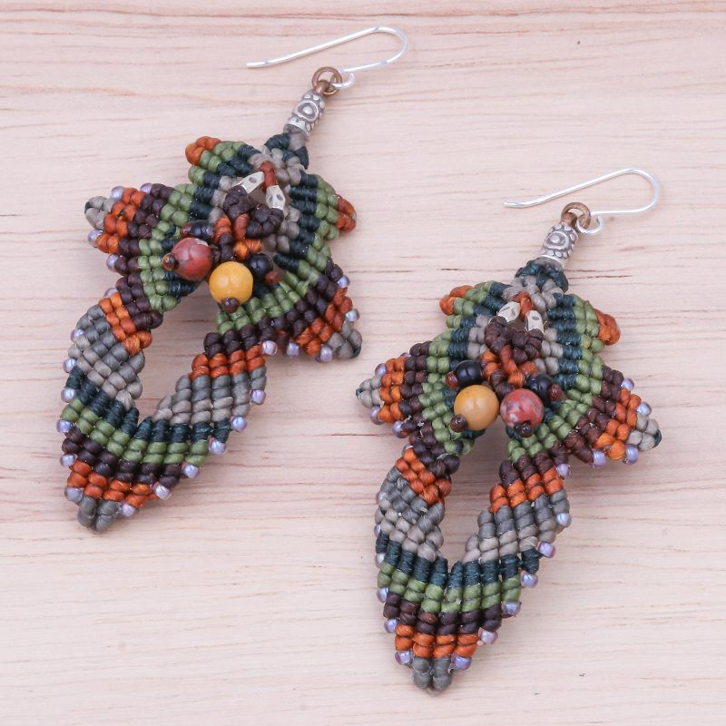 Slip these earrings on first thing in the morning and your watch your day unfold into a wonderful adventure. Each macrame earring is hand knotted from intertwining green, brown, and grey polyester cord, and finished with shining jasper and onyx gemstones in the center. Purple glass beads accentuate these earrings, which swing from sterling silver hooks.