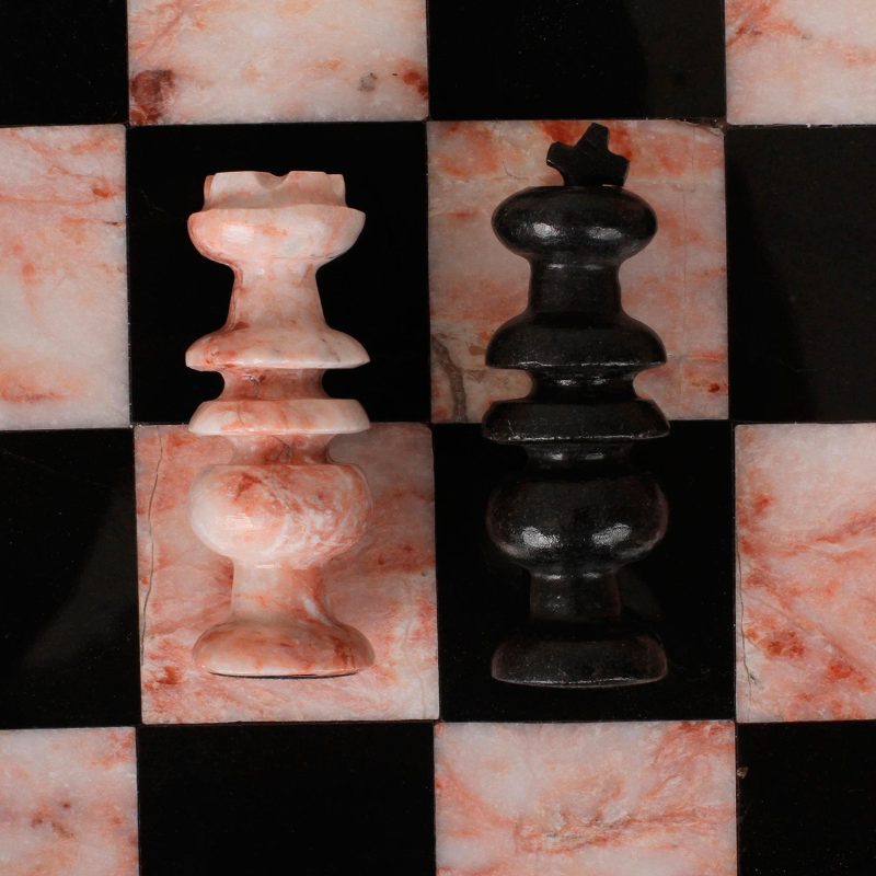 The ancient strength of stone attests to the challenges faced by the chess fan. Sculpted of richly-veined black and rose marble, this extraordinary chess set brings a touch of luxury to the game. It is a design by the Sierra Family of Mexico.