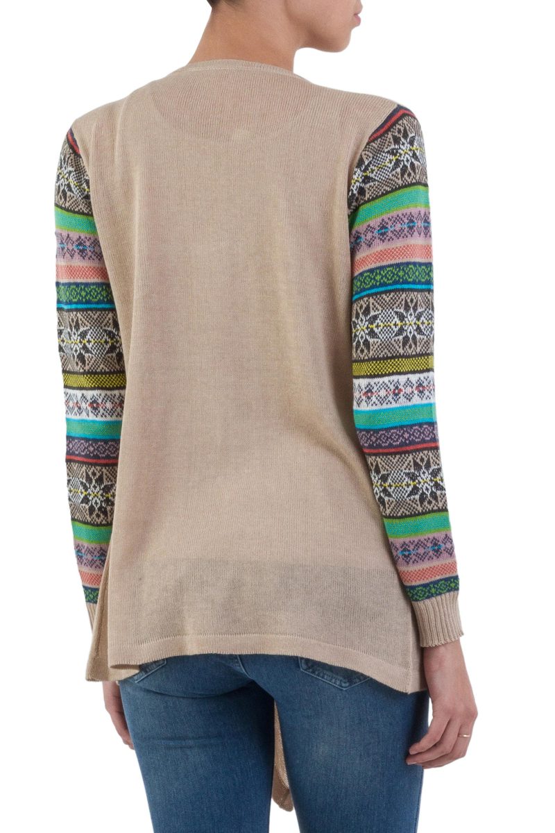 Star gazers will love this unique cardigan from Peru! Designed by artisan Fernando Cano, this cardigan features colorful striped sleeves knit with star patterns and an open, flowing front in beige. This cozy cardigan will keep you warm on cool days and nights.