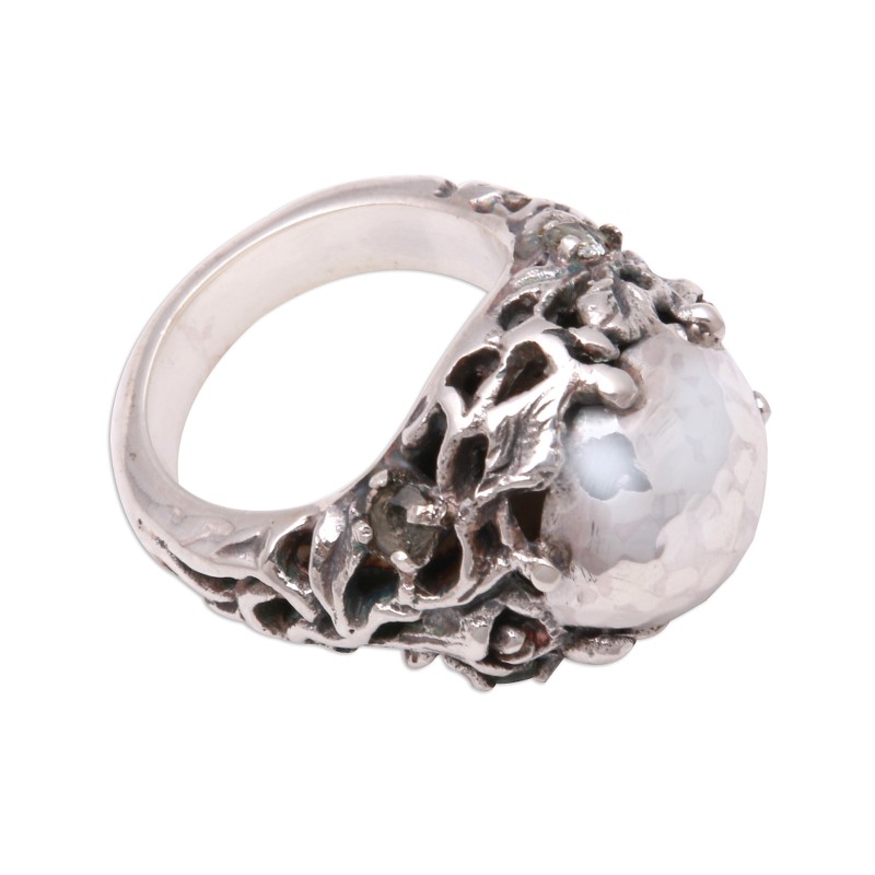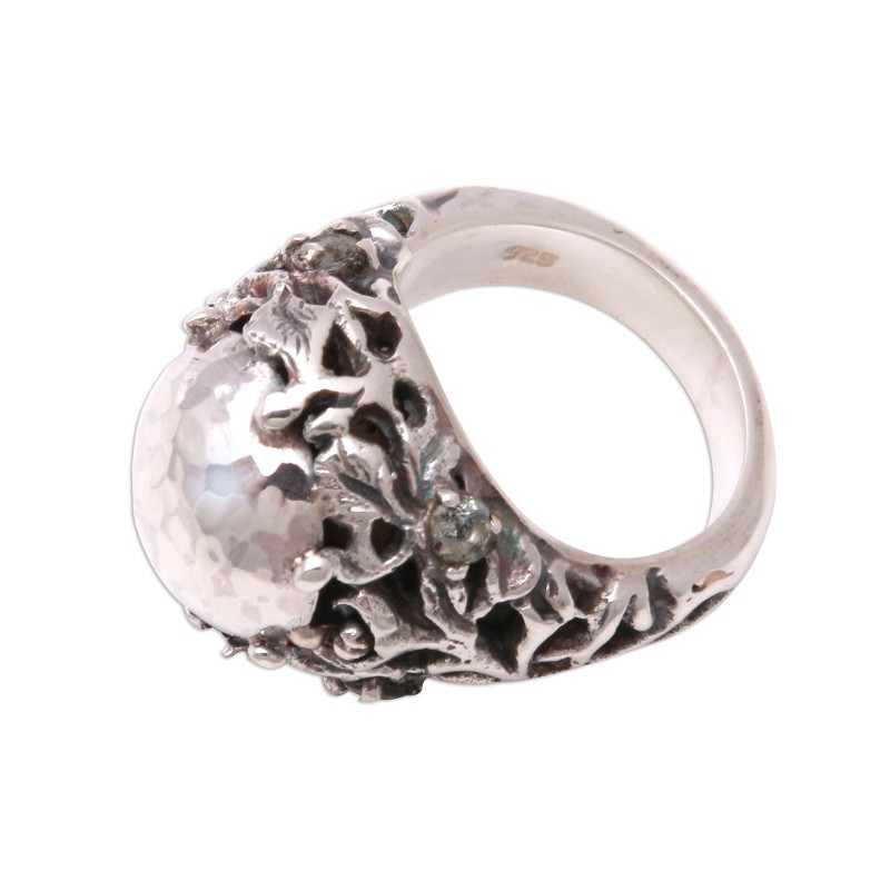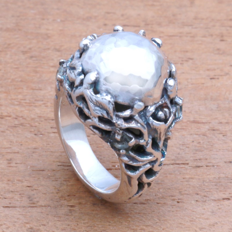 Cradled by leafy roots, a "rock" forms the dome of this sterling silver ring from Java. Rosalia Tarigan designs this ring, which is studded with petite peridot gemstones that sparkle.