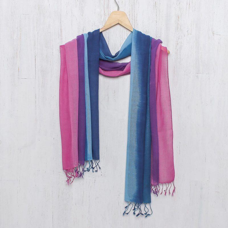 artesano tailandés Vinita diseña un fascinante par de bufandas cruzadas. Tejidas a mano con algodón, las bufandas son ligeras y frescas y se completan con delicados flecos en cada extremo. Una bufanda presenta rayas sombrías que combinan del índigo al cerúleo, mientras que la otra va del amatista al clavel para una combinación ganadora.