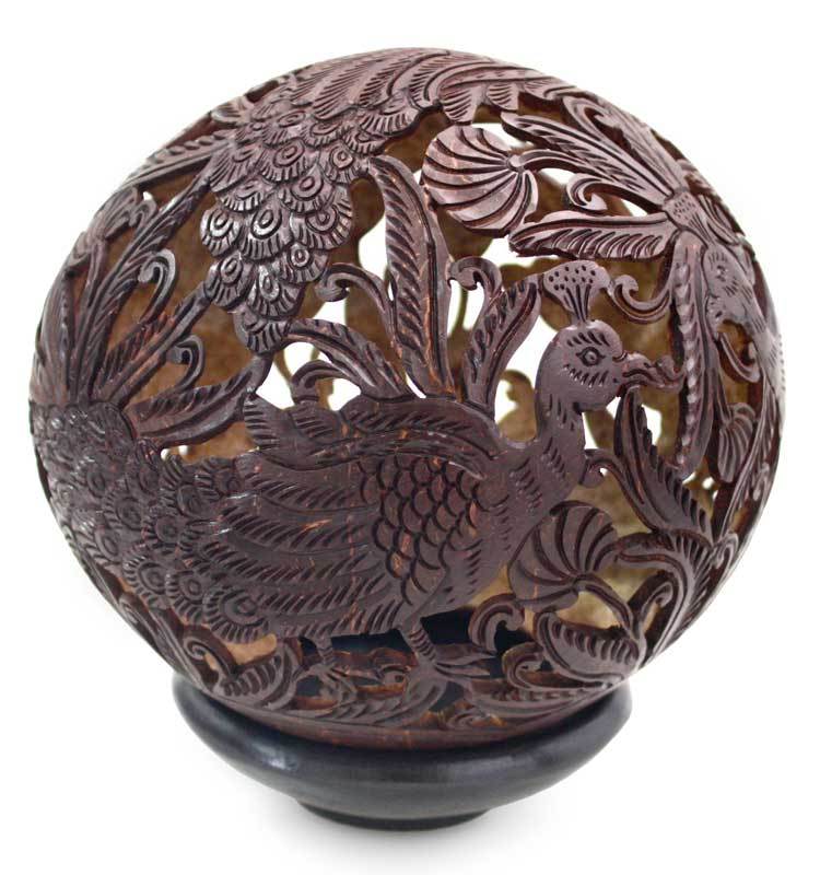 Pavos reales acicalados hacen alarde de su elegante plumaje en esta escultura de Putra Suteja. Para mantener viva la herencia artesanal de su difunto marido, Eka quita la cáscara de una cáscara de coco y pule la pieza hasta darle brillo antes de tallar las imágenes. Preciosa y original, se apoya sobre una base de madera de albesia.