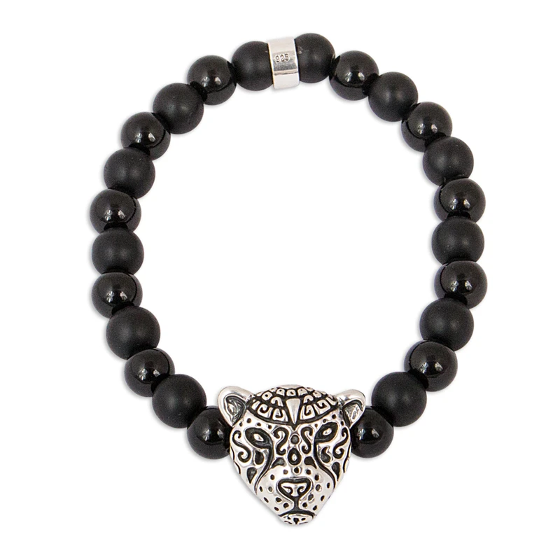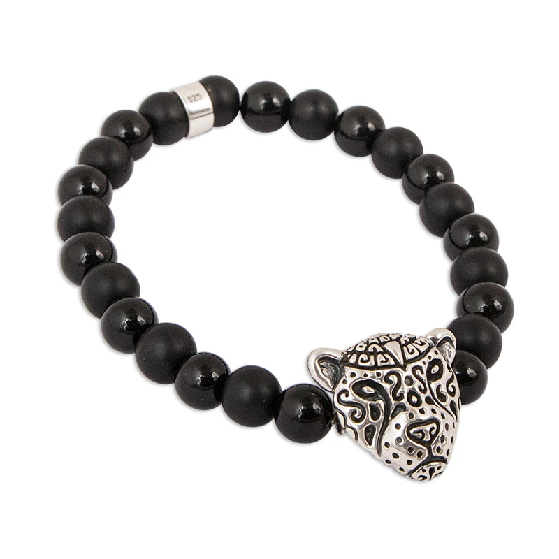 Elaborada en plata de ley, la cara estilizada de un feroz jaguar forma el colgante de esta pulsera mexicana. Intrincados patrones oxidados decoran el colgante, que centra una hebra de cuentas de ónix en acabados mate y pulido alternados, culminando en una cuenta de ley frente al colgante. artesano mexicano Angel Ortiz diseña esta pulsera elástica, elaborada siguiendo la tradición de las artesanías de Taxco.