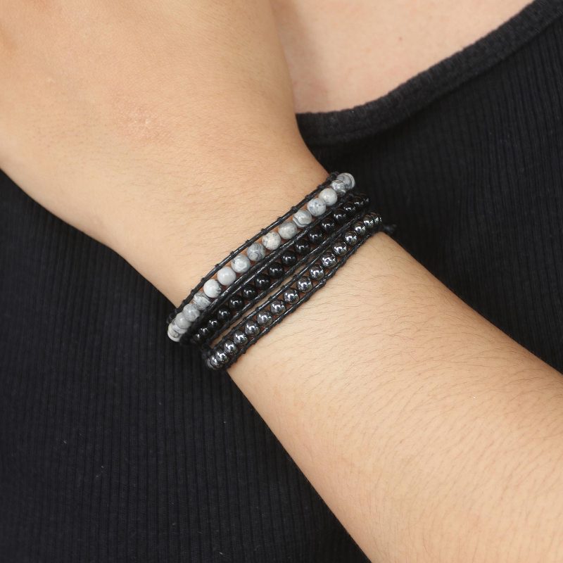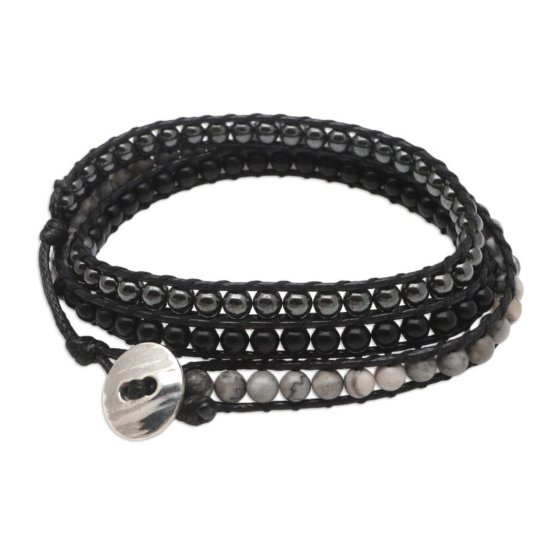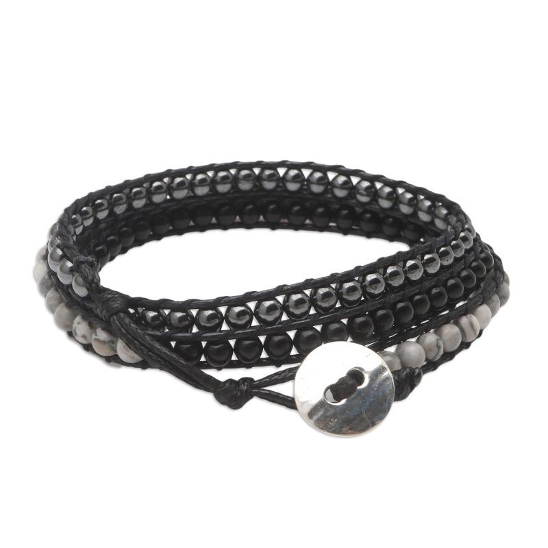 Diseñado con un esquema de color monocromático, el brazalete cruzado de Ayu Widiani es una forma elegante de complementar tu atuendo. Los artesanos balineses elaboran a mano el brazalete a partir de un trío de gemas: ónix negro, hematita reflectante y cuentas de jaspe gris moteado. Un cordón de algodón duradero mantiene todo en su lugar, mientras que un broche de botón de plata esterlina agrega brillo.