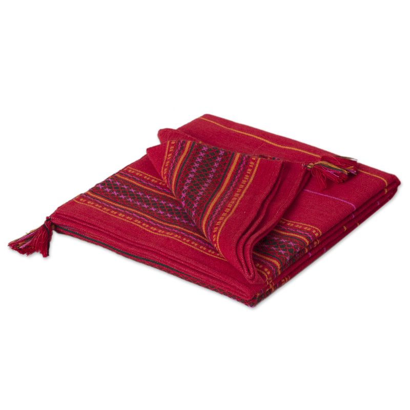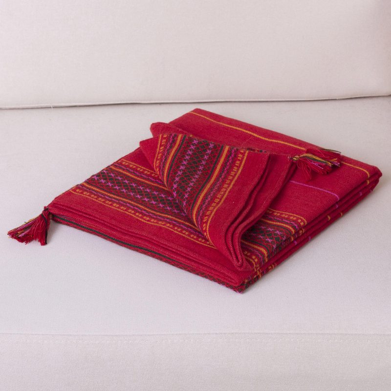 Like butterfly wings, intricate motifs center wide bands of color. W. Rojas Yuri weaves a stunning throw on the Andean handloom. The blend of luxurious alpaca wool and the deep red tones make this a focal point in any setting.
