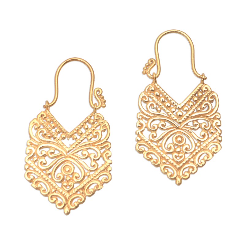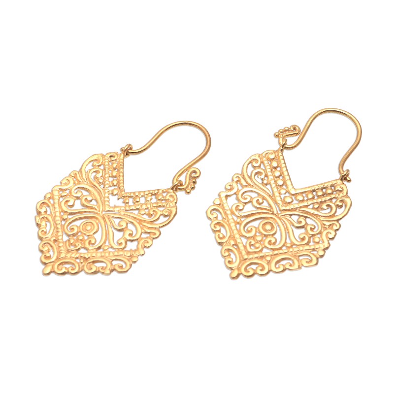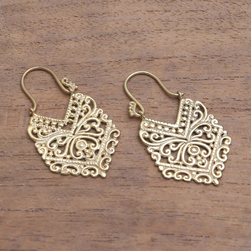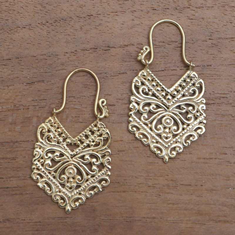 Realized in brass bathed in 18k gold, majestic openwork and angular shapes are displayed in these drop earrings from Bali. Komang Budiarta presents these earrings, crafted by local artisans. These earrings are named Pura, meaning "temple" in Indonesian.