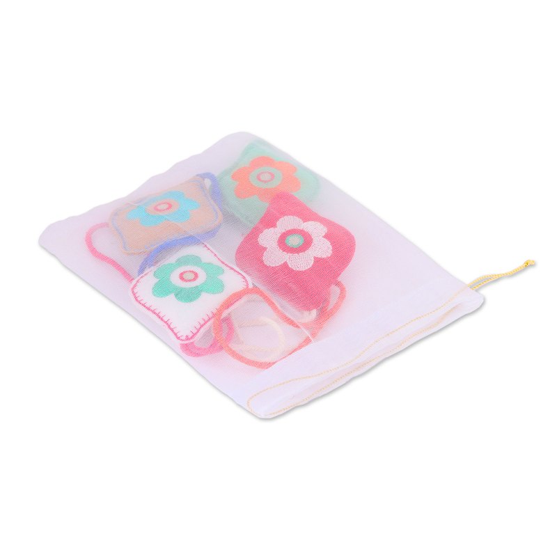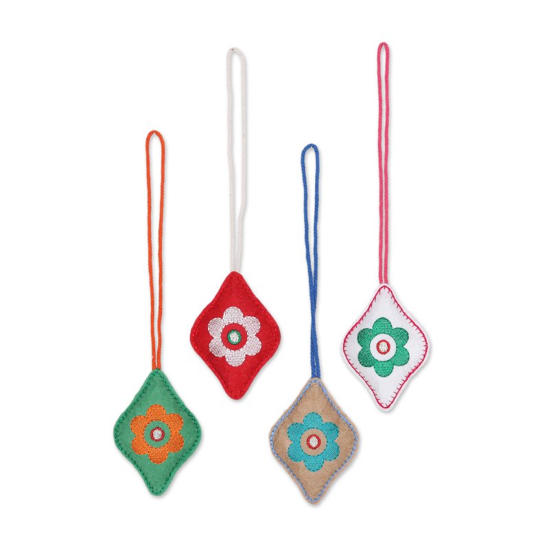 This cheerful set of four ornaments is presented by Asha Prabha, who works with local artisans to craft them by hand from soft wool felt. Each diamond is embroidered with a colorful flower and hangs from a yarn loop in a contrasting color. The set of four ornaments arrives in a sheer polyester storage pouch.