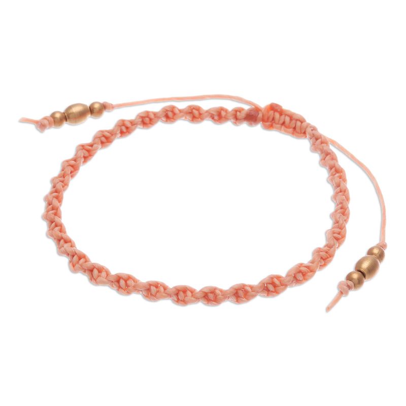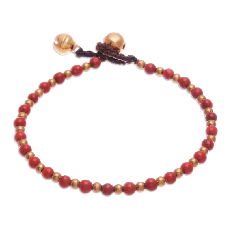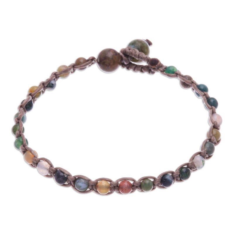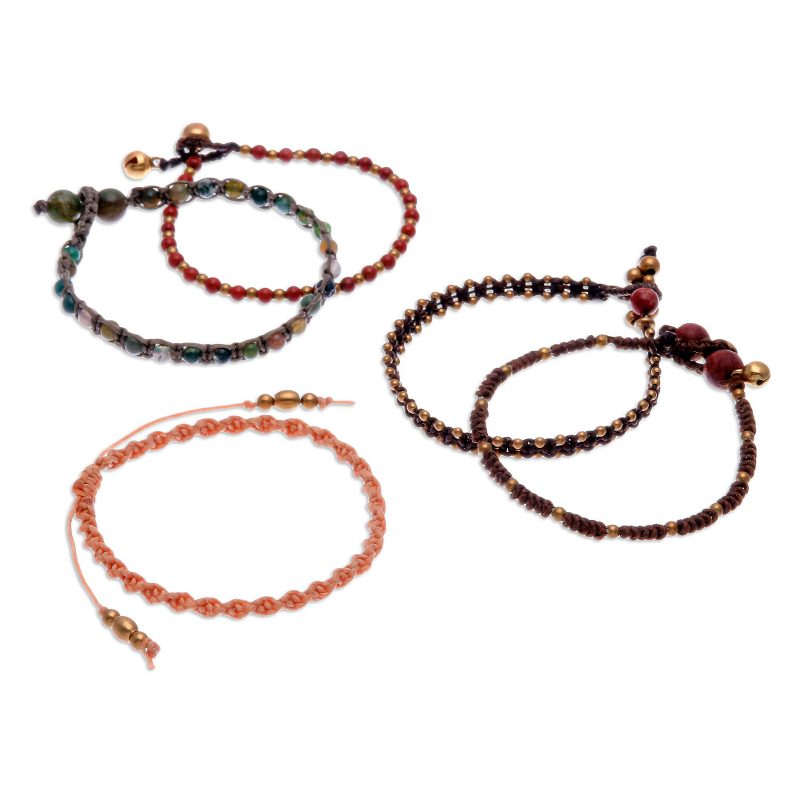 This set of five bracelets designed by Thai artisan Tiraphan Hasub gives you a pretty accessory for each day of the work week. The artisan hand knots waxed polyester cord around richly colored beads using macrame techniques to create the set. Each bracelet is embellished with a combination of red jasper, green agate, raintree wood beads, and shining brass.