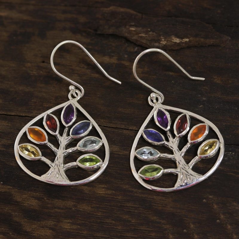 Sure to bring balance and harmony to your wardrobe, these dangle earrings from India are presented by Chintan. Local artisans craft the drop-shaped earrings from sterling silver, setting the gleaming trees with marquise gems of blue topaz, carnelian, garnet, citrine, peridot, amethyst, and sapphire, which represent the body's seven chakras.
