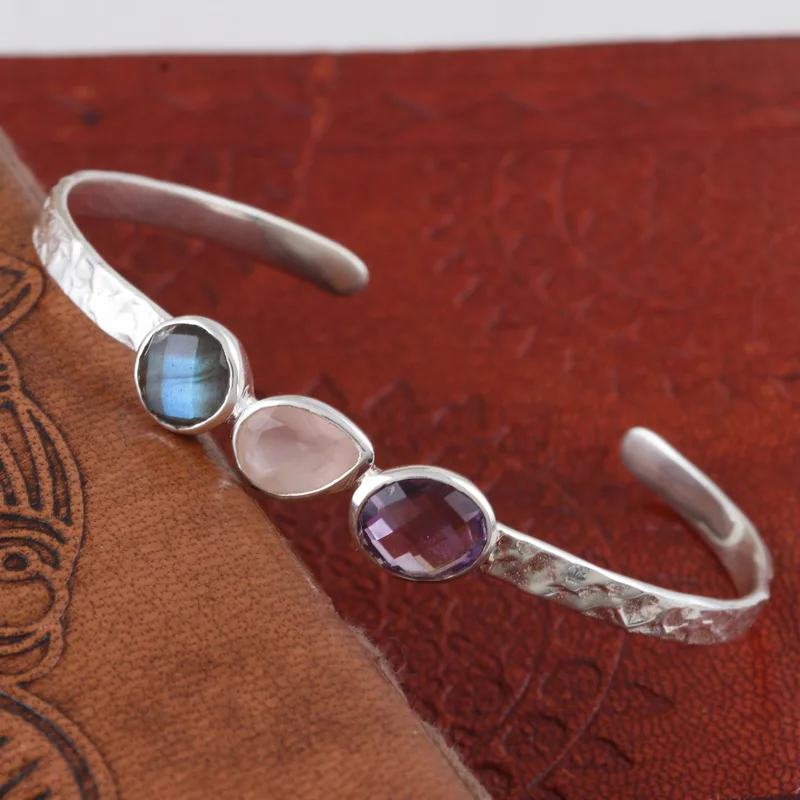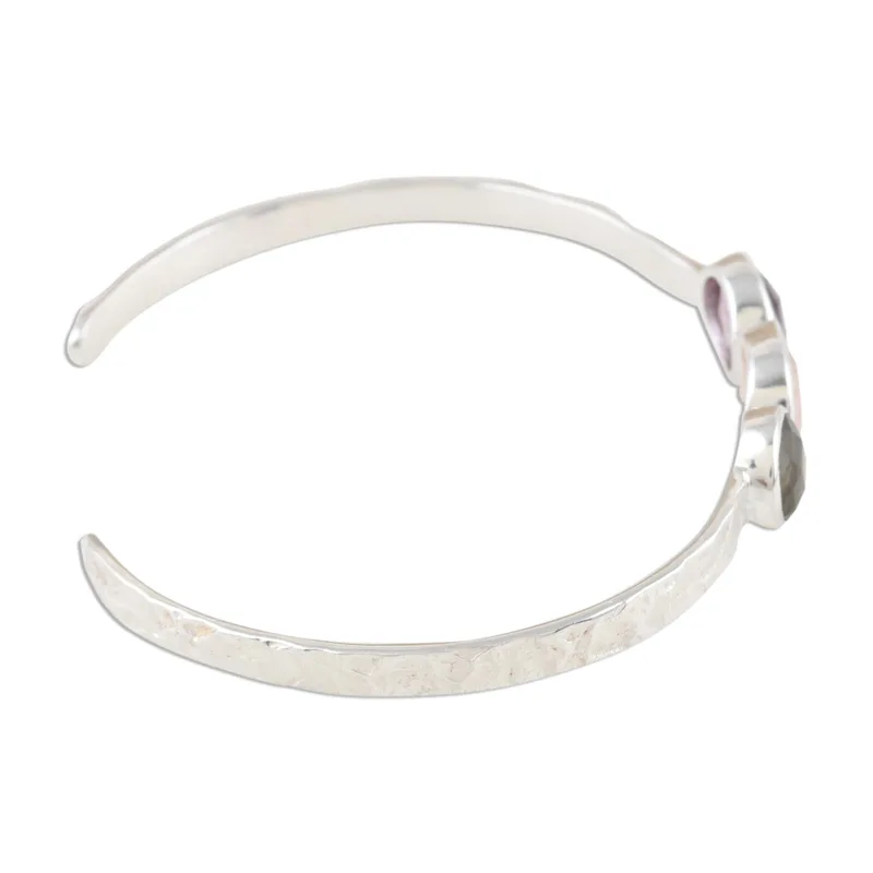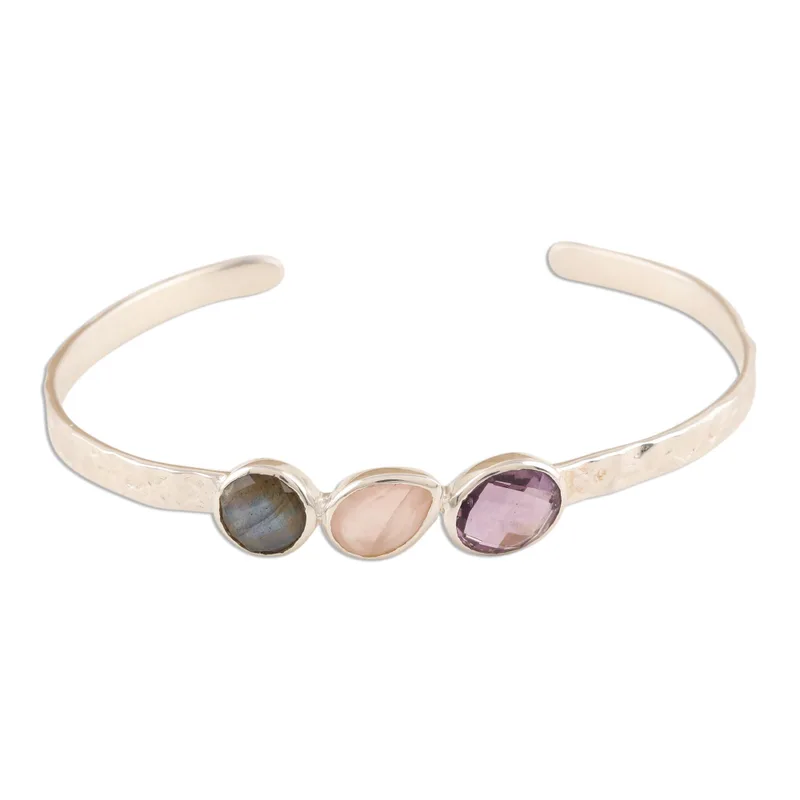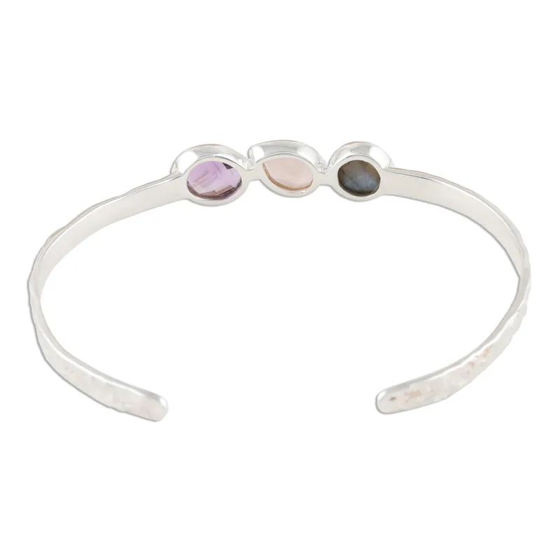 A captivating trio of rose quartz, labradorite and amethyst in different shapes center this bracelet from Indian designer Neetu Barathi. The faceted gemstones grace a heavily textured sterling silver cuff.