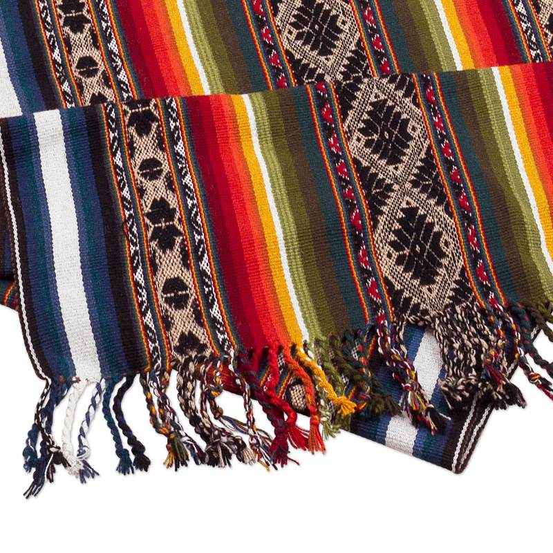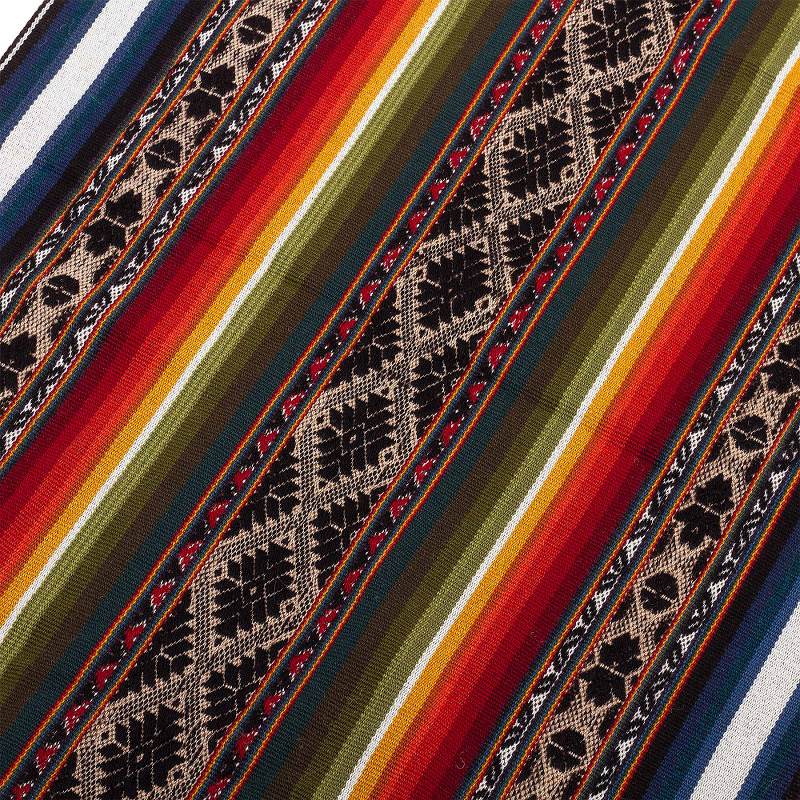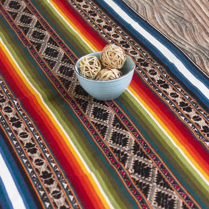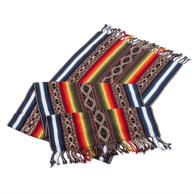 This stunning table runner is from Peru's Kathiana Quispe, who weaves it by hand on a traditional loom. The alpaca-blend runner features colorful stripes alternating with Inca motifs in black and beige. Hand-knotted fringe accents both ends.