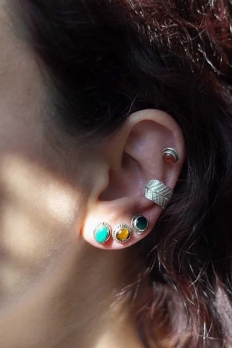Framed by elegant designs in sterling silver, various gemstones are displayed in this set of seven stud earrings from India. Bhavya Jain works with green and black onyx, carnelian, labradorite, tiger's eye, composite turquoise, and cultured pearl to create this set, which arrives with a felt patch that is embroidered with the days of the week; store your earrings on this patch that also provides a fun way to wear each one!