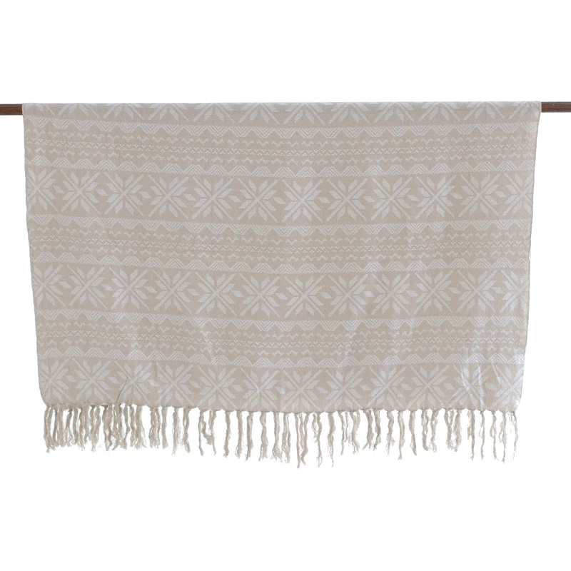 Sandeep Malhotra's team of talented Indian artisans transforms the traditional snowflake pattern into an elegant design. Working with cotton in champagne and snow white hues, the artisans weave a charming throw, perfect for adding coziness to the winter season. On top of that, the design has cute dangling fringes.