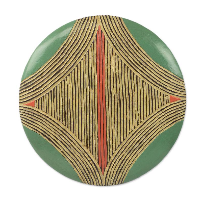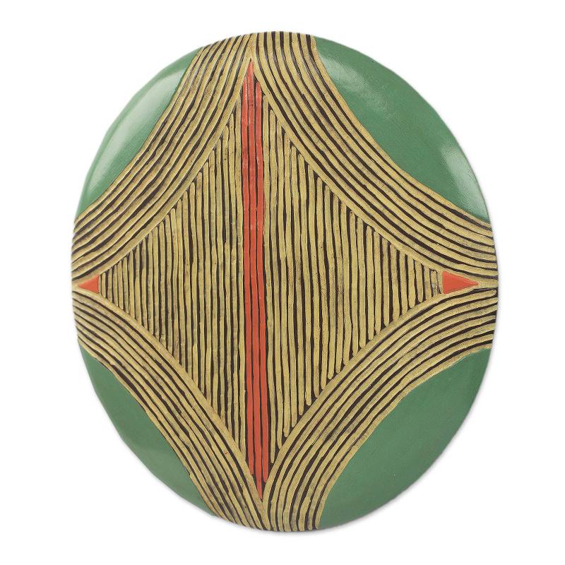 Abstract in concept, this African mask represents those used in rituals by the Kidumu men's society. Christopher Nyasafo takes his inspiration from the Teke-Tsaye people of Gabon and the Democratic Republic of Congo. The Ghanaian artisan carves the piece by hand and paints it in green, orange and ivory.