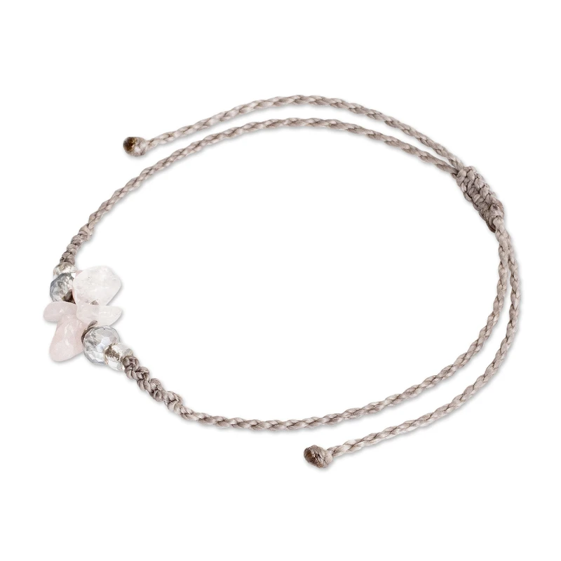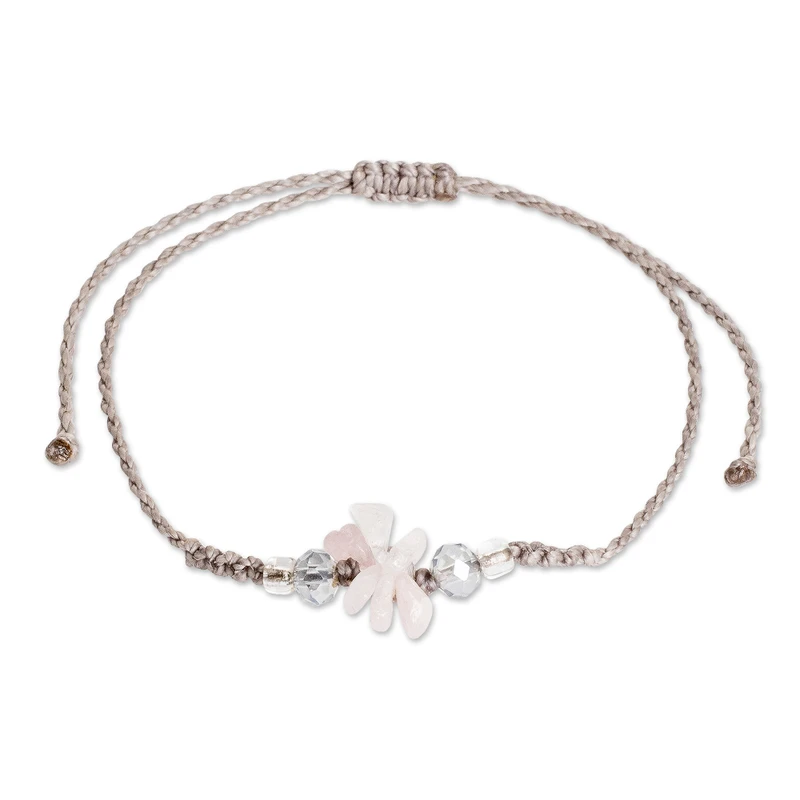 From the prosperous lands of Costa Rica, a charming design calls for healing energies to enter your life. Magaly and Rebeca Valverde work with waxed nylon cords in a lovely beige hue to craft this macrame bracelet, whose floral pendant is composed of natural rose quartz jewels, displaying a serene pink tone complemented by crystals and glass beads.