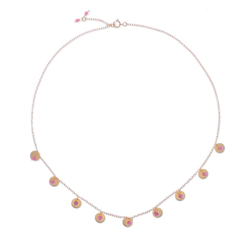 Some hearts enjoy adding color, artistry and creativity to the elements that surround them, embodying the energy of the tourmaline beads that embellish Somsiri Juntamin's creation. Made in Thailand, this 18k gold-plated sterling silver charm necklace arranges the pink jewels around shiny pendants, all in a matte finish that captivates with sweet grace.