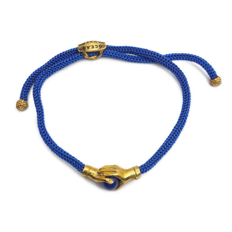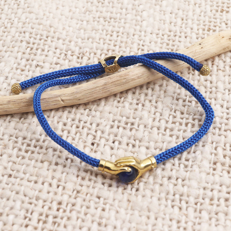 Clasping an orb of polished blue agate, gleaming brass hands share the weight of the world in this beautiful interpretation of friendship. Handcrafted by Balinese jewelry artisan, Henry Anthony Sanny, this adjustable blue cord bracelet features a sliding brass closure inscribed with the words: "Ocean Lover".