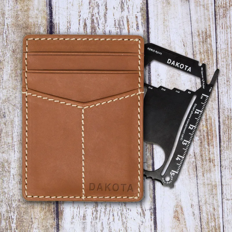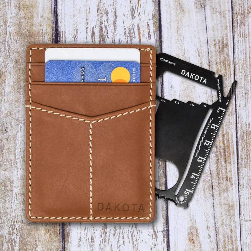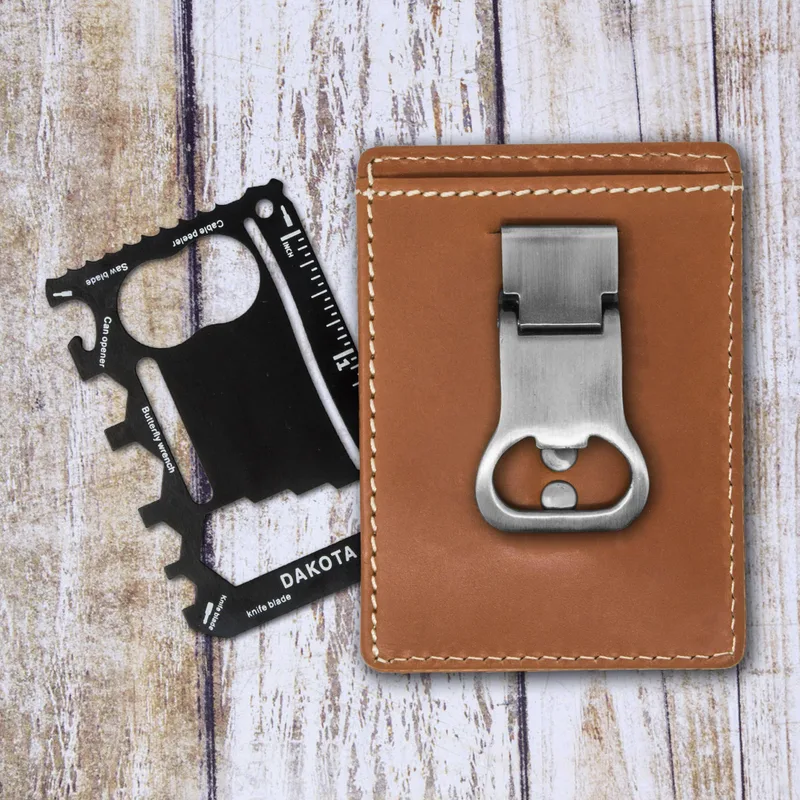 Go wallet-free with this ingenious all-in-one tool. Made of durable leather, it has four slots for cards or cash as well as a money clip that doubles as a bottle opener. RFID blocking for added security. A stainless steel, credit card–sized multitool slips into its own slot and includes a knife blade, ruler, can opener, screwdriver, butterfly wrench, saw blade, file, and key ring hole.