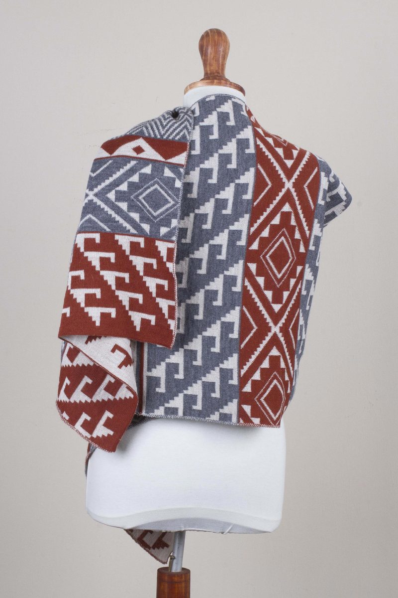 Beautiful diamond motifs in slate are flanked with geometric waves of brick in this Peruvian shawl. Designed by Waldo Berrios, the shawl is woven with alpaca and wool blend fibers to achieve a soft cold weather accessory.