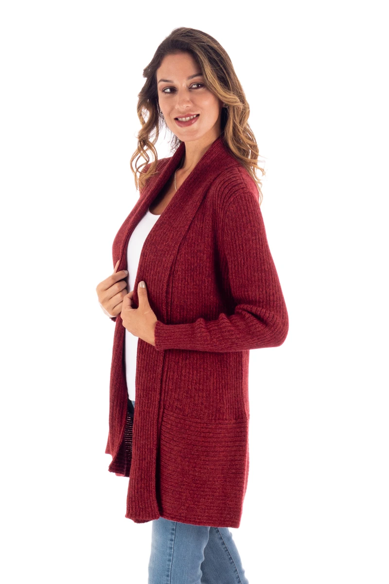 This alpaca blend open cardigan sweater by Pia Zavala in Peru features a cardinal red yarn to provide an interesting texture and a sense of warmth. It wraps loosely around the body, making it a charming accessory for casual wear.
