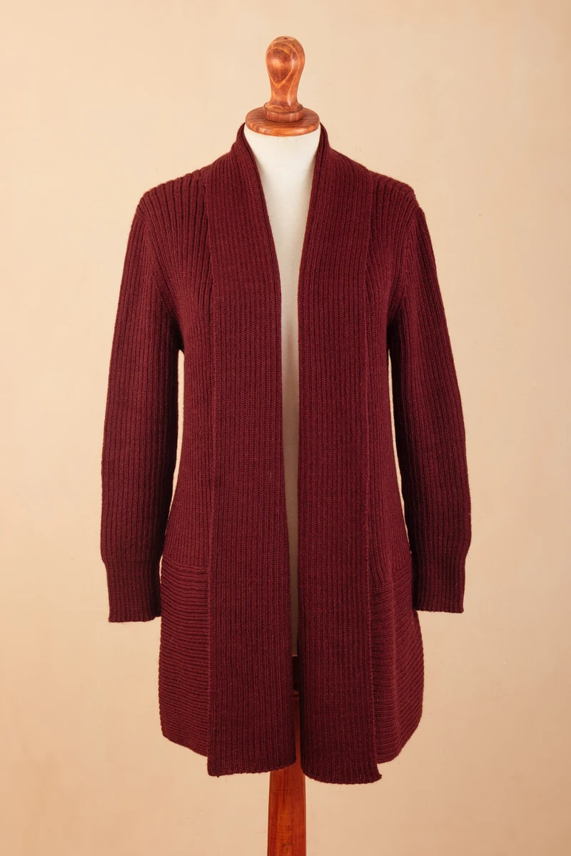 You can find our alpaca blend cardigan sweater 'Red Wrap' by Pia Zavala in clothing categories such as Alpaca Sweaters, Alpaca Wool Sweaters and Cardigans Sweaters. Enjoy exploring these sections for other Novica treasures.