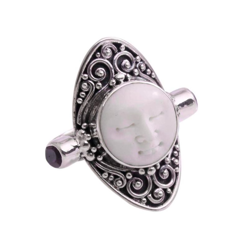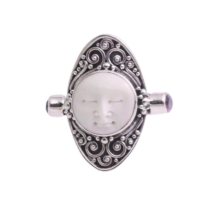 Eyes closed in an expression of tranquility, a sleeping face is hand-carved of bone to center this stunning cocktail ring from Bali. Buana crafts the ring of sterling silver, framing the snoozing face with swirl and dot motifs in a combination of finishes. Sparkling amethyst gems decorate the sides of the face.