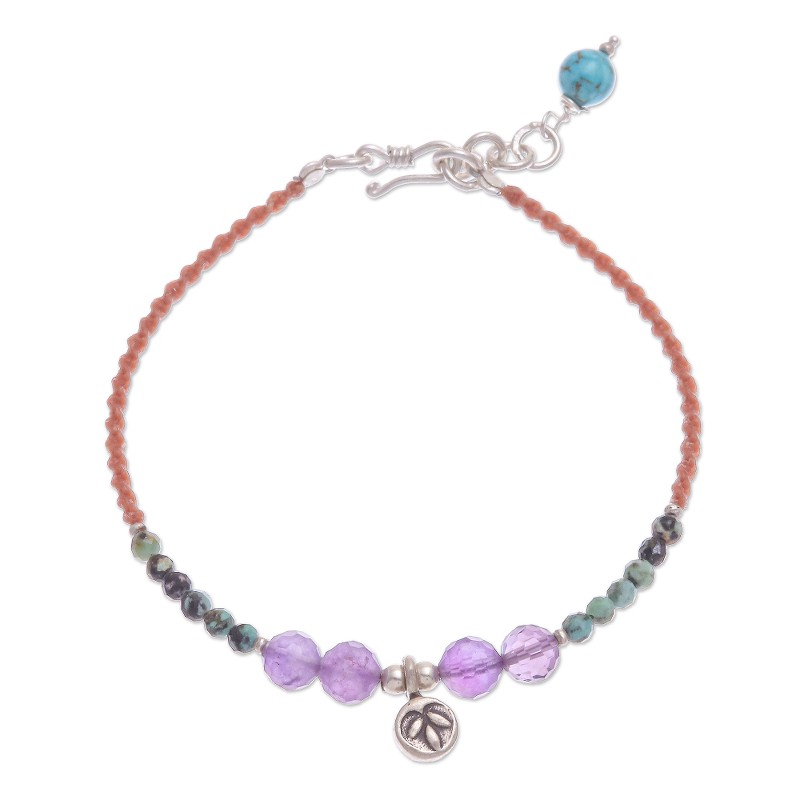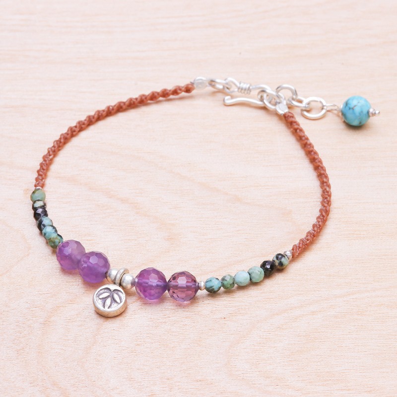 Samart Takham designs and crafts this beaded cord bracelet by hand in her Thailand studio. A twist of waxed polyester cord gives way to a series of faceted amethyst and reconstituted turquoise beads, with a Karen hill tribe 950 silver charm at the center. The bracelet features a hook clasp and extender chain with a single reconstituted turquoise bead at the end.