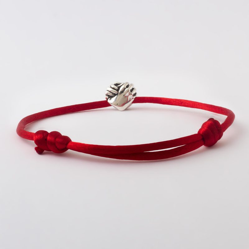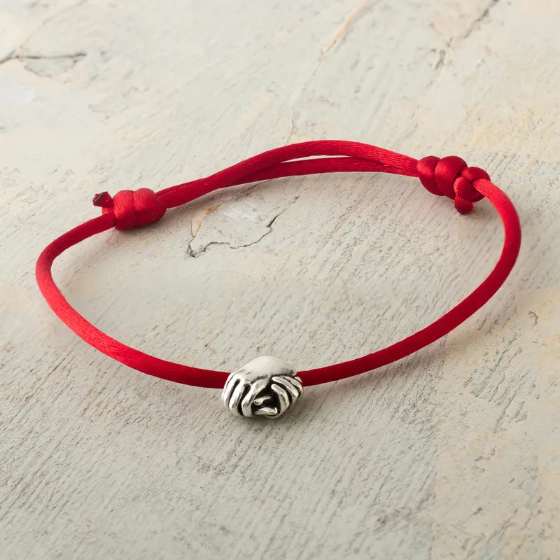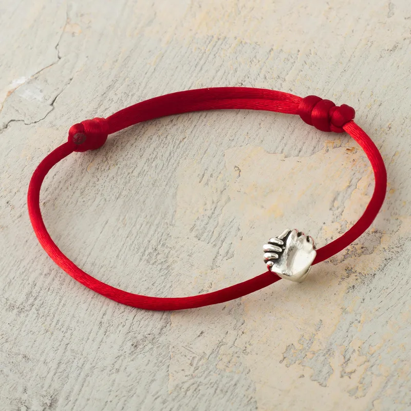 Hands clasp one another in a gesture of solidarity. "This design is inspired by togetherness and empathy in our most difficult moments. I want to share my hope that we can unite without borders, without differences, and overcome our problems in life," Jose Luis Pariona confides. "I want to give life and hope." The Andean artisan displays his sterling silver pendant on a red cord unity bracelet.