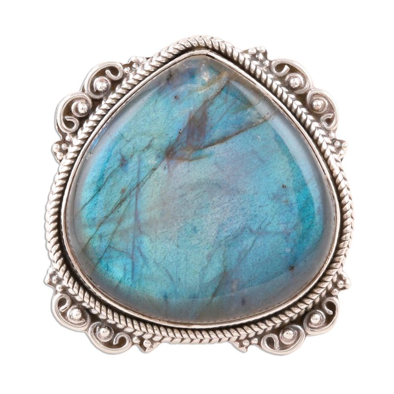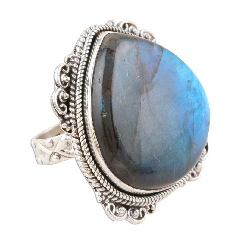 A breathtaking cabochon of labradorite distinguishes this cocktail ring from Rakesh Rana in India. The generously-sized gem is set in sterling silver with a rope-edged bezel and flourishes of silver wire and beading. Artisans sets the gem on a textured sterling silver band.