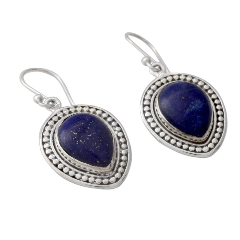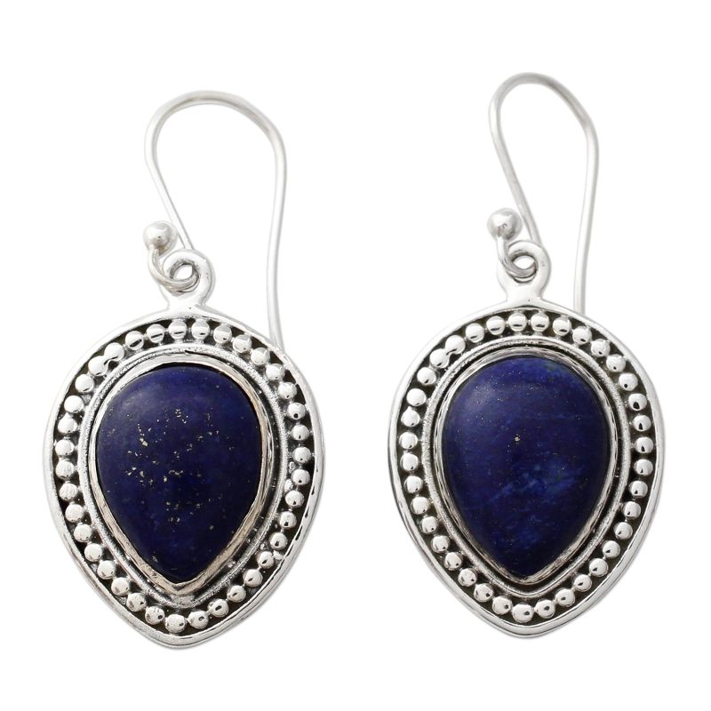 Exuding royal elegance, these deep blue earrings crafted from lapis lazuli bezel-set in sterling silver are presented to us by Shanker. The dotted design framing the precious lapis lazuli is called rawa work in India.