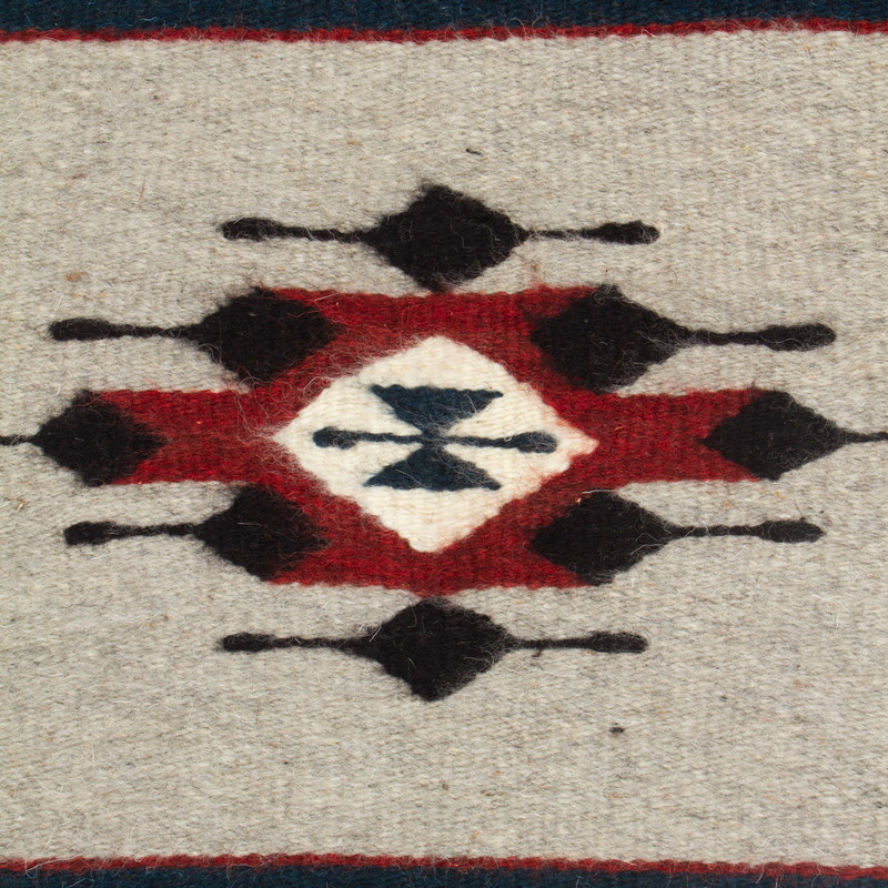 The Ruiz Bazan Family continues the long Zapotec textile tradition with this table mat, whose refined wool yarns form a classic geometric pattern. A palette of grey, red and navy hues composes the design's diamond motifs, symbolizing the region's glorious past.