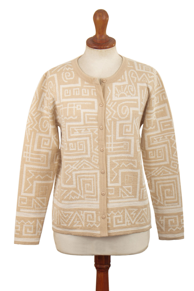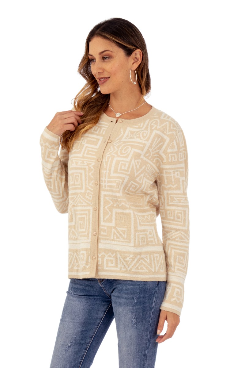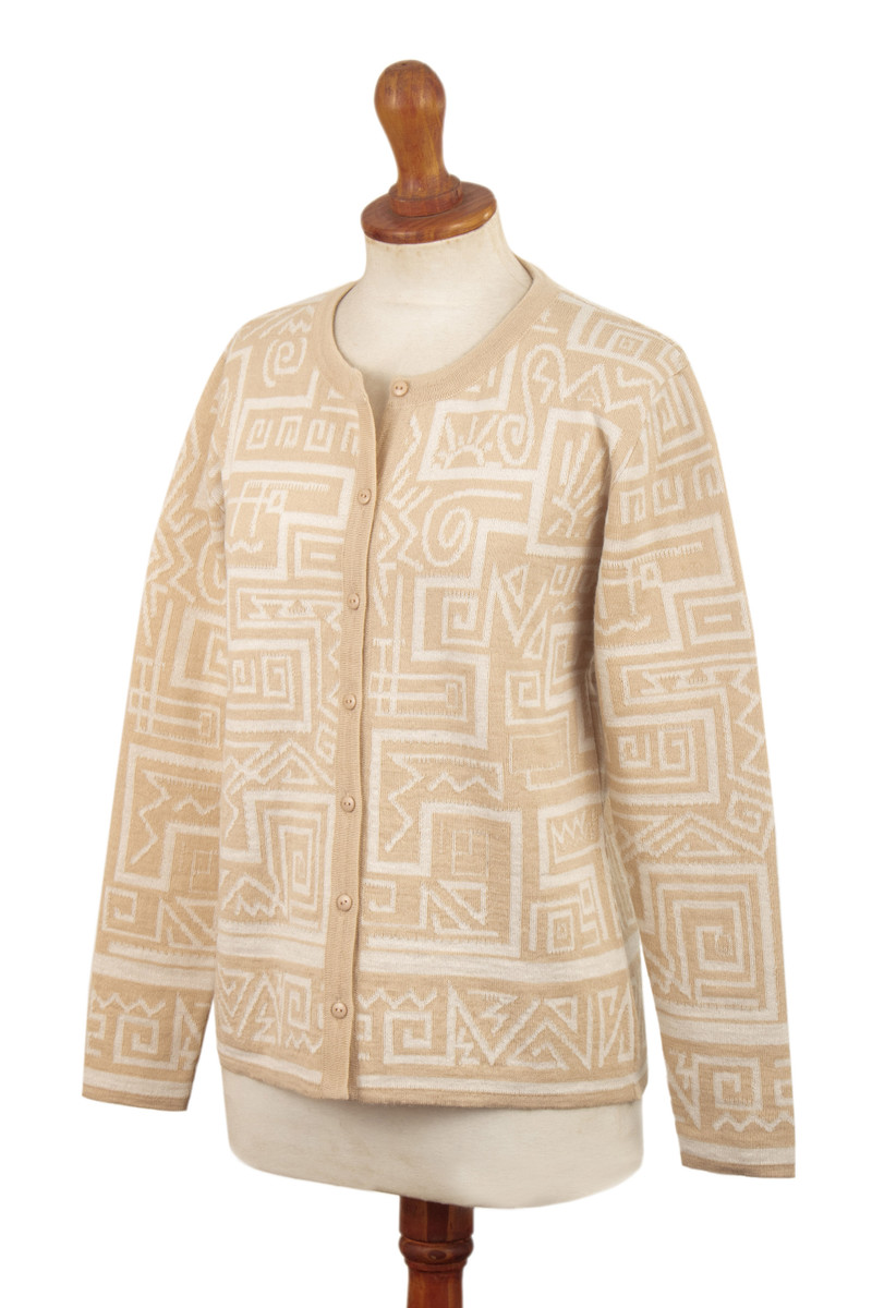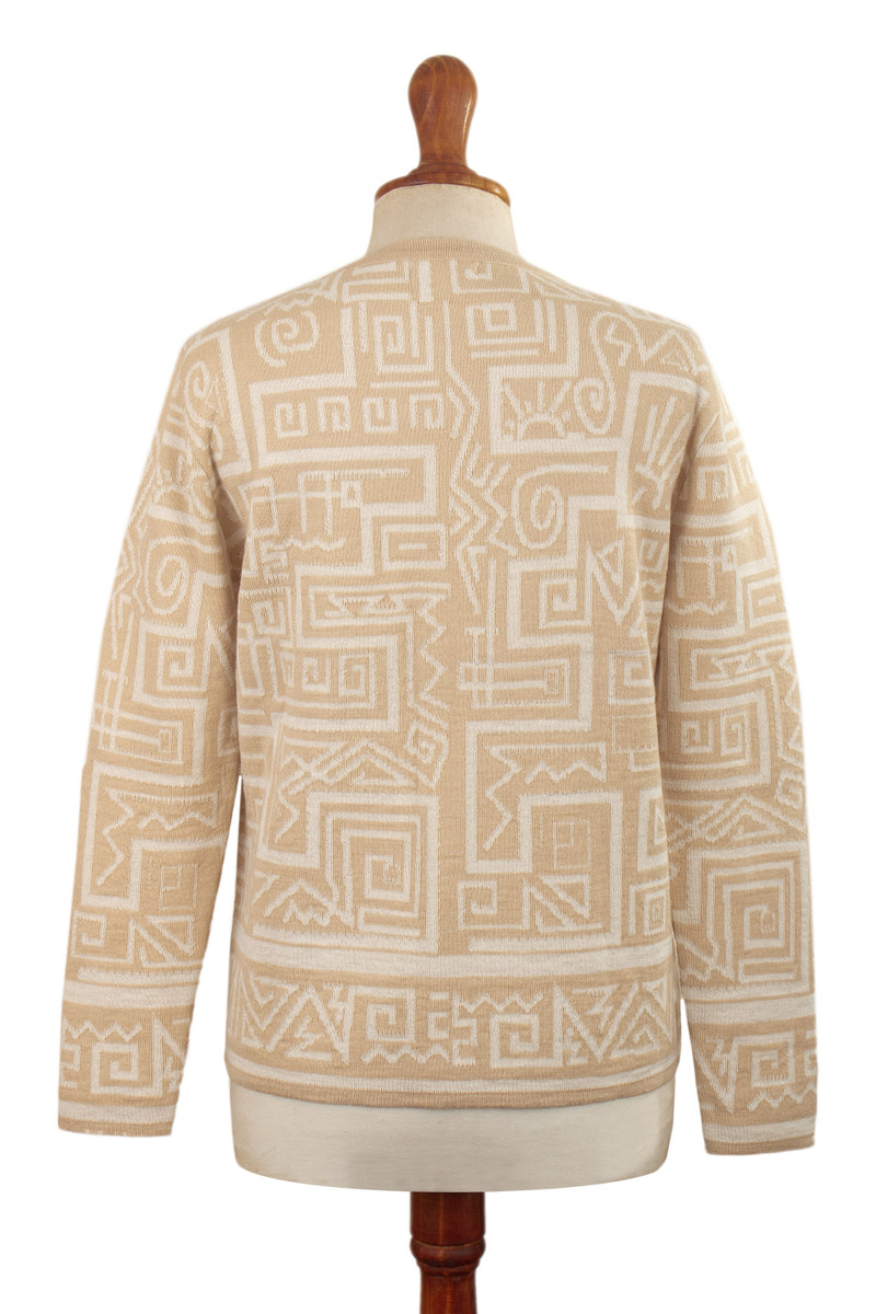Pre-Hispanic motifs go all over this soft sweater crafted by Peruvian artisan Santos Cano. Using an acrylic, alpaca and wool blend, Santos designs every detail of the garment, choosing a palette of beige and white hues. Furthermore, the item features a comfortable crew neck, long sleeves for cozy wear, and a buttoned closure.