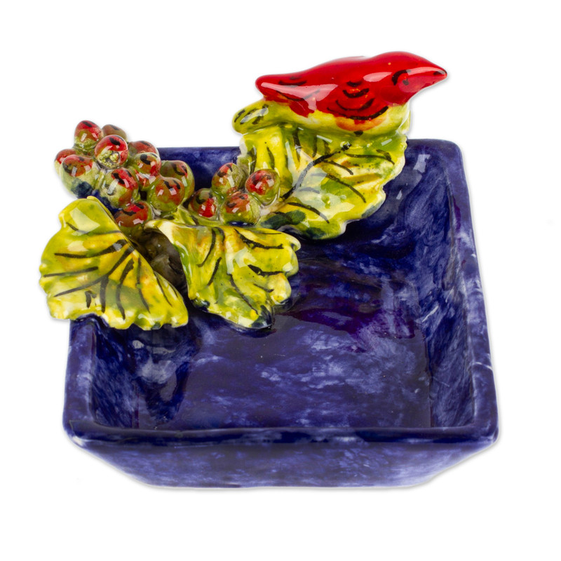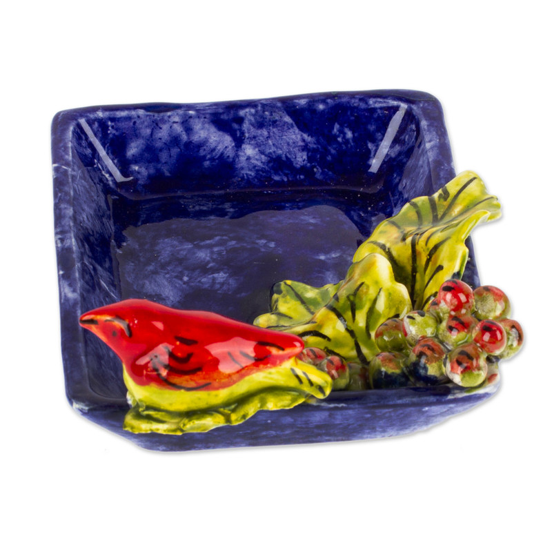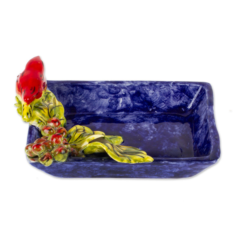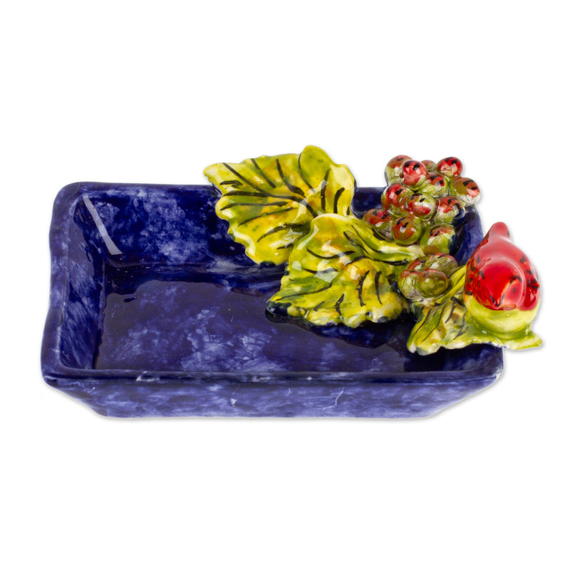 Delivery EstimateWorking in the style of traditional majolica ceramics, the Mellado Family crafts this pretty snack bowl or candy dish. The blue dish is rectangular, and features detailed grape leaves and a grape bunch perched on the rim alongside a scarlet bird. The bowl makes a handy server for snacks or candy, or simply display it as a unique decorative accent.