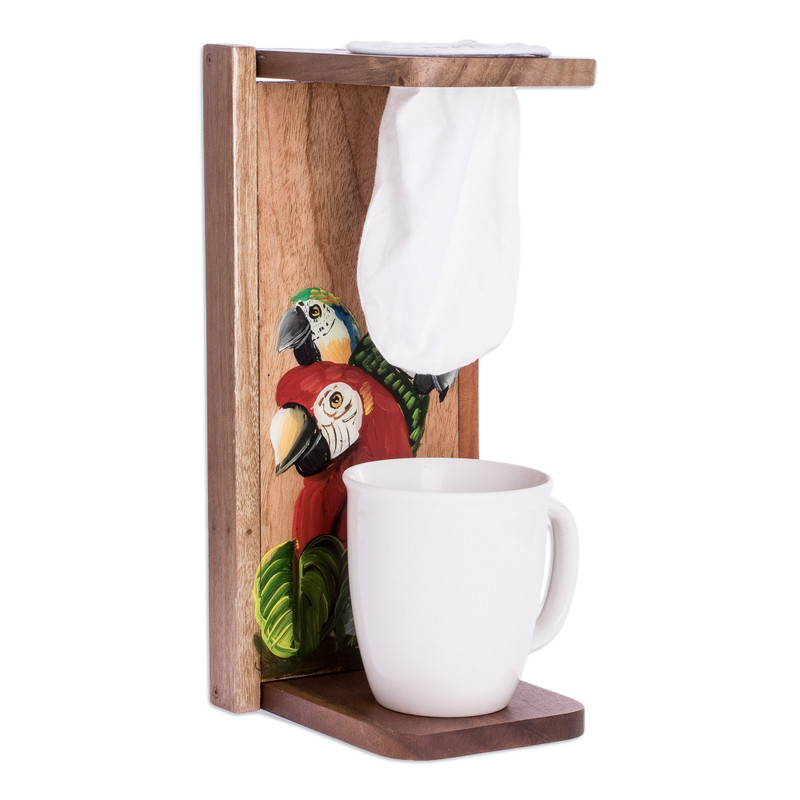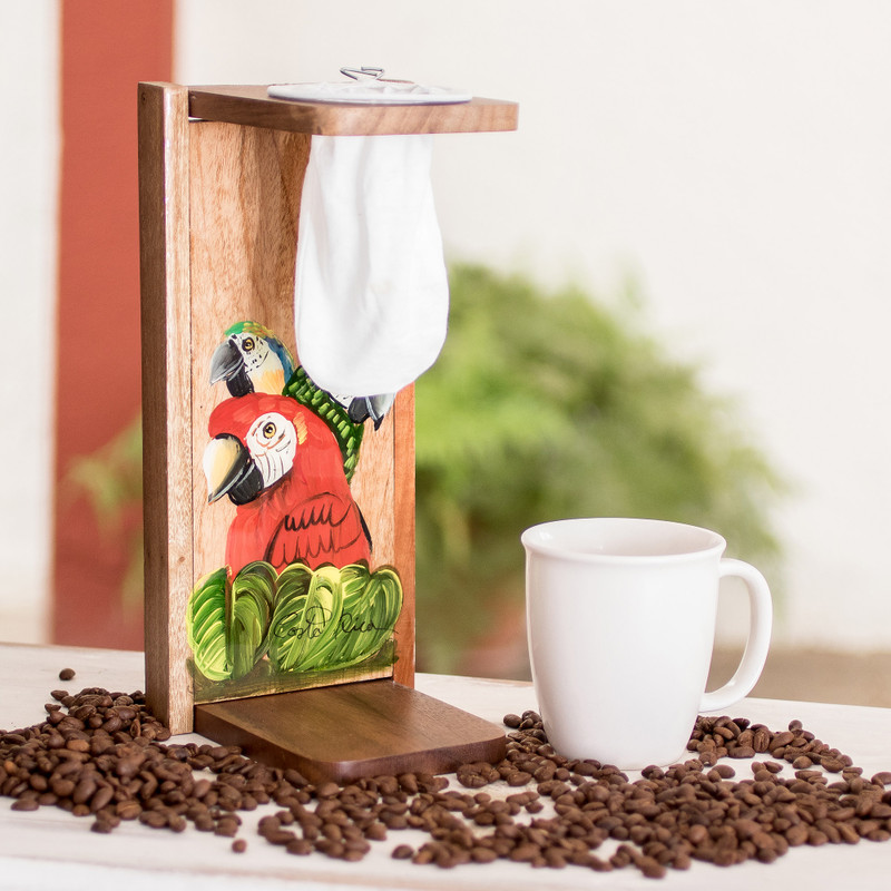 Costa Ricans make coffee using a chorreador, a wooden drip coffee stand. Artisan Jorge Leiton invites you to make coffee the Costa Rican way with this beautifully hand-painted single-serve stand. Place your favorite mug on the base and fill the cotton filter bag at the top with coffee. Then, simply pour hot water through the filter to make your very own drip coffee.
