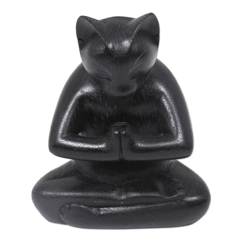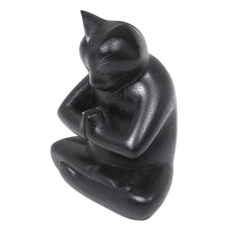 A serene black cat clasps its paws as though in prayer. This whimsical image comes from Nengah Sudarsana, who shares his love for animals through his work. Carved from Balinese suar wood, the sculpture is beautifully created by hand.