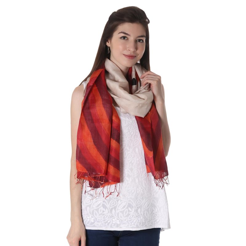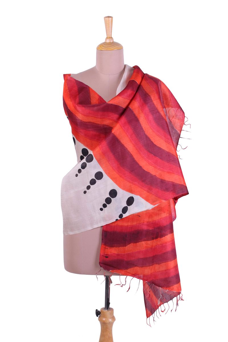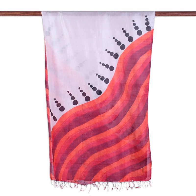 Fantastic waves in tones of red are block-printed onto the ecru body of this sumptuous Indian shawl. Sikha Gangopadhay carries on artisanal traditions, presenting this inspiring accessory. Crafted of silk, the shawl is completed with petite fringes at each end.