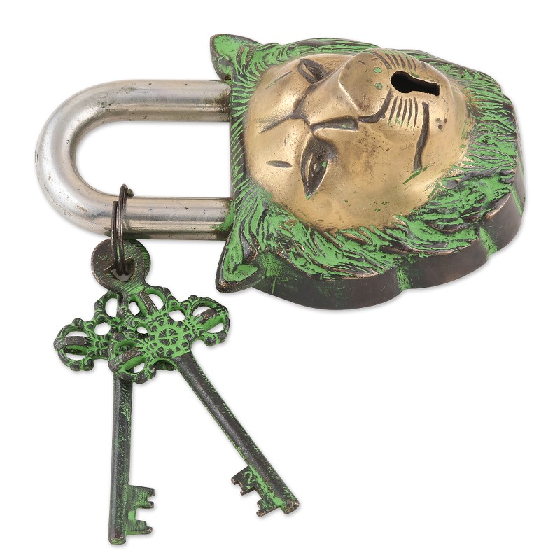 Coated with an antique green patina, Khalid Ali's lock and key set is both fully functioning and wonderfully evocative as a home accent. Accompanied with a spare key, the brass set is crafted by Indian artisans, who cast the lion's head with fine detailing.