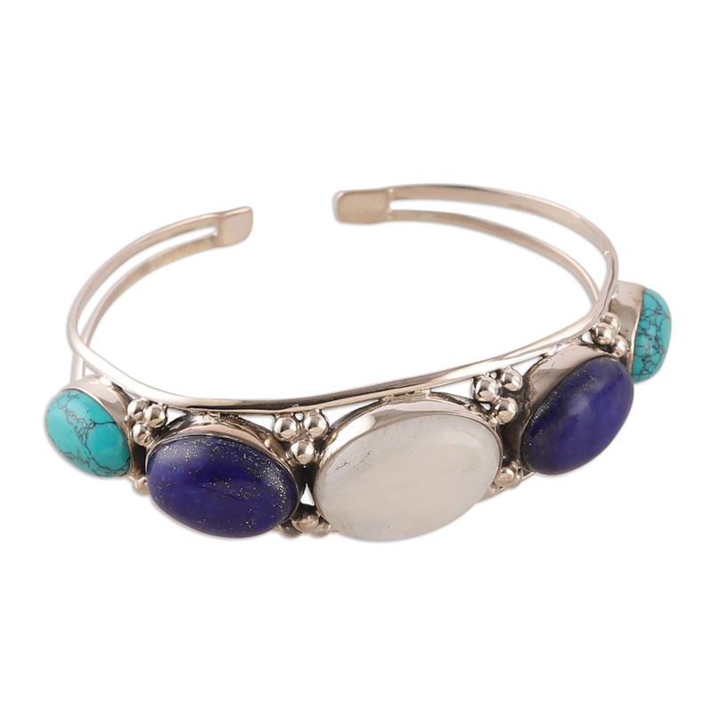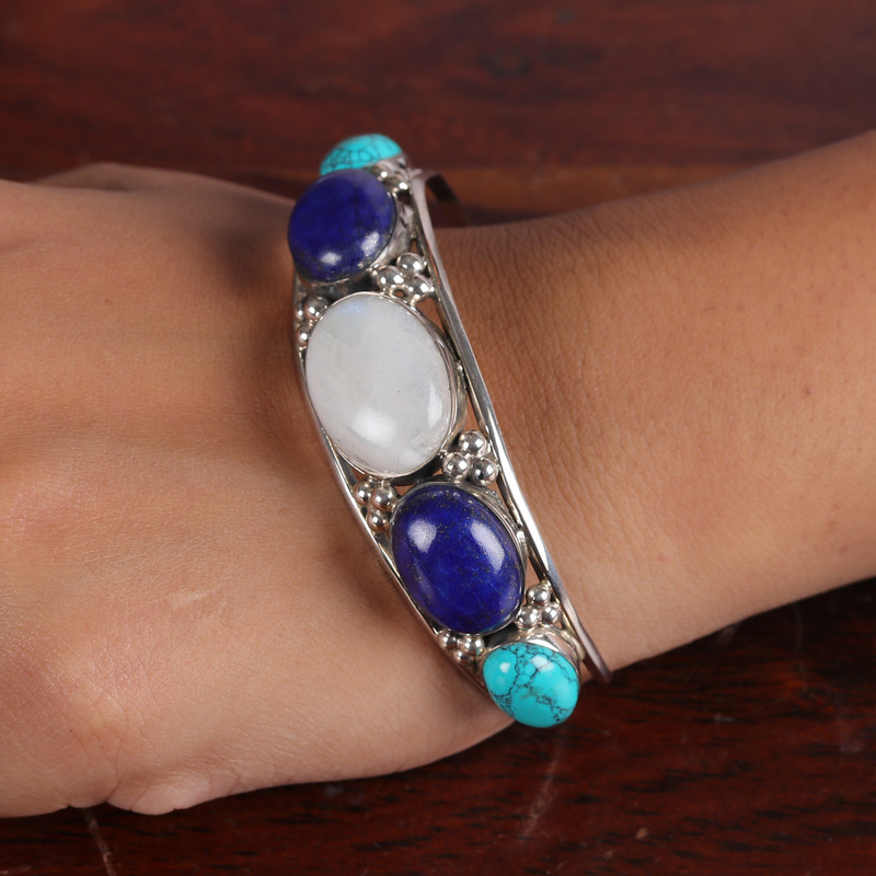 This breathtaking cuff bracelet showcases the vibrant beauty of colorful gemstones, with radiant calcite, lapis lazuli and rainbow moonstone set in gleaming sterling silver. With an impressive estimate of 33 carats, this chic accessory presented by India's Neeru Goel is accented with intricate dot details expertly created using the granulation technique.