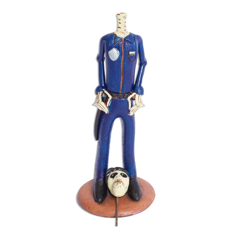 In a homage to José Guadalupe Posada's "La Calavera Catrina", Mexico's Jorge Escamilla creates this unique sculpture. Wearing a uniform and a badge and carrying a club, the skeletal security guard is crafted of clay and steel wire. The original "La Calavera Catrina" was a zinc etching created by the artist José Guadalupe Posada in Mexico around 1910. Posada created the character, a female skeleton with an elegant hat, as a satirical portrait to lampoon Mexican natives who aspired to European style and denied their own heritage. The catrina has since become an emblem of Mexico's Day of the Dead celebration and a popular folk art subject.