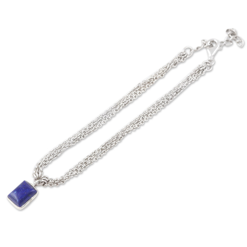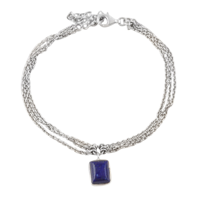 A smooth rectangular lapis lazuli gemstone set within a sterling silver bezel dangles from the center of this marvelous charm bracelet created by Bhavya Jain in India. Her unique design sees three cable chains come together in the middle and at the end with a silver loop and crowned by the deep blue gemstone.
