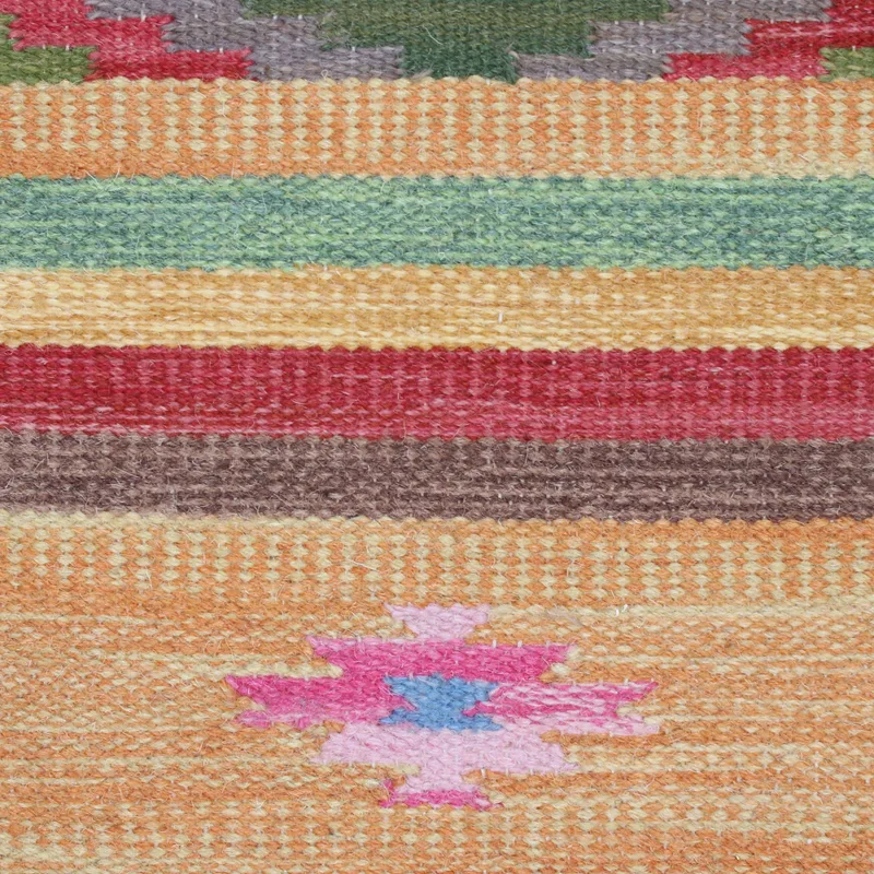 Capturing the colors of Delhi, this area rug is offered by Indian artisan Sonik Sethi. Local artisans work on a traditional loom, weaving this rug by hand from wool. Colorful stripes and chevron patterns decorate the length of this rug, which is accented at the ends with fringes.