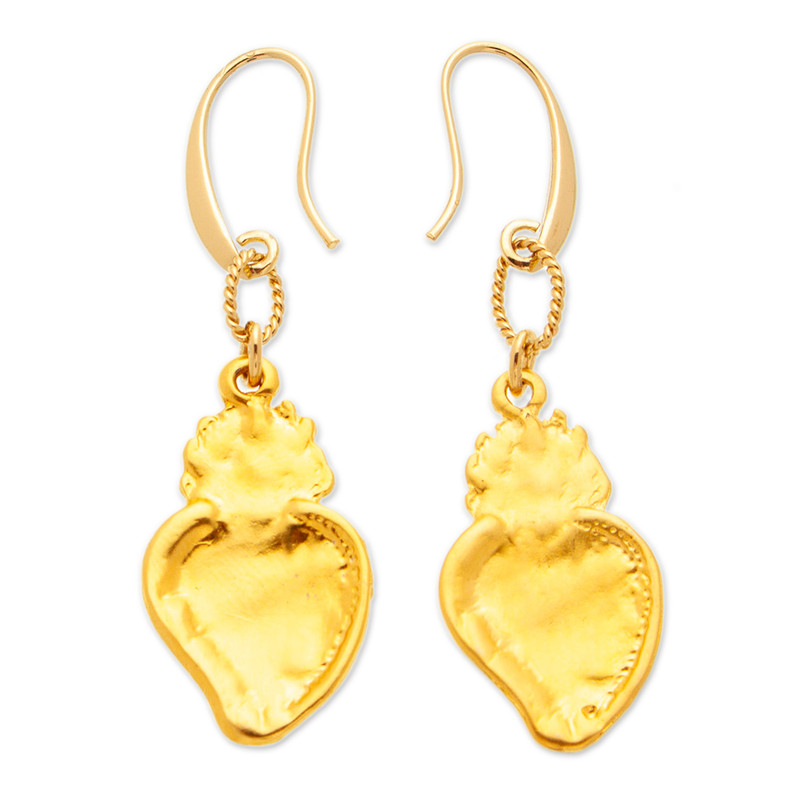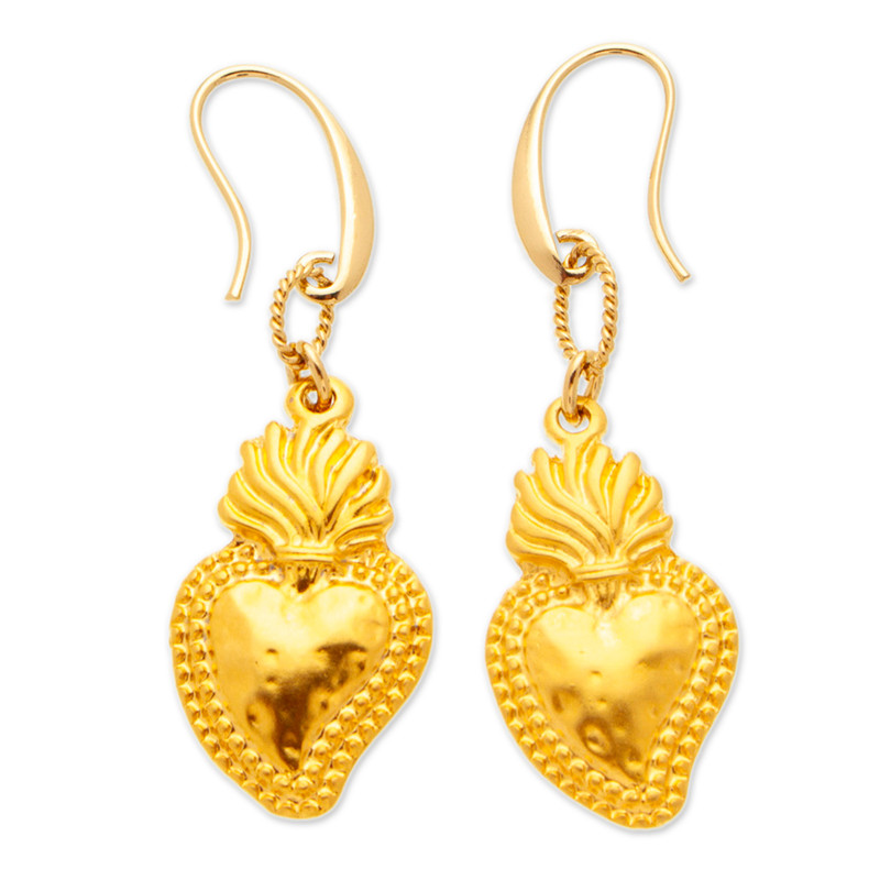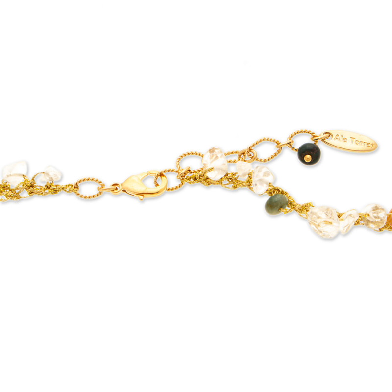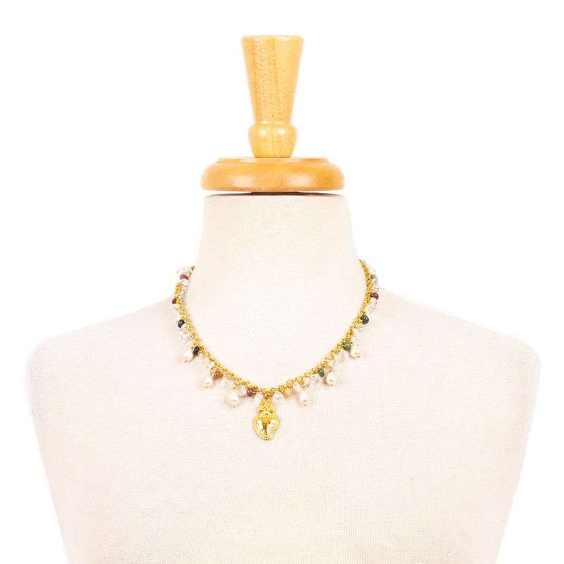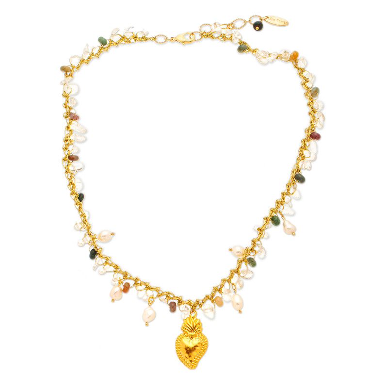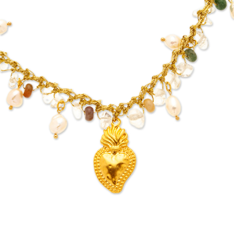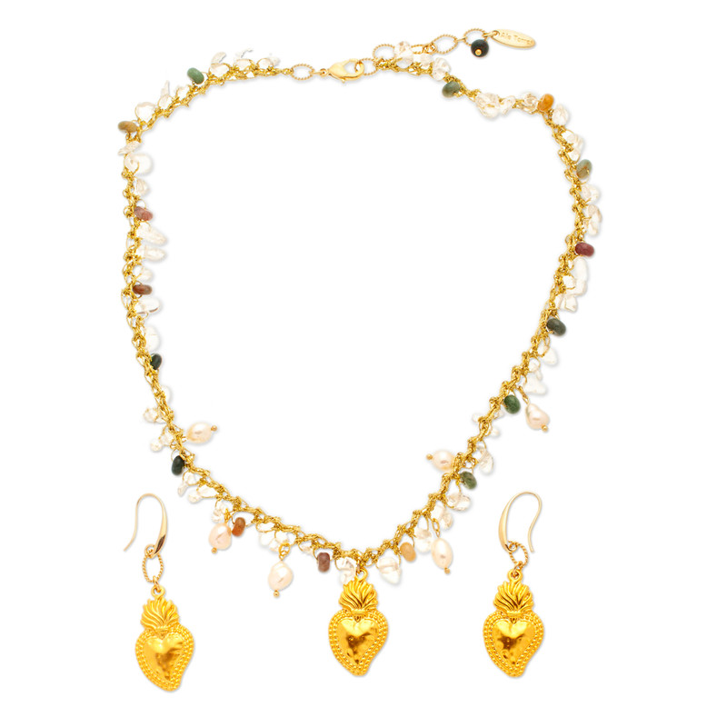 Mexico's Alejandra Torres enriches her faith with a combination of precious gems, each with a unique message. The artisan works with 18k gold-plated brass and golden polyester threads to create this jewelry set, composed of a necklace and earrings decorated with Sacred Heart charms. Quartz jewels of clarity, green agate beads of renewal and cultured pearls of innocence complete the set.