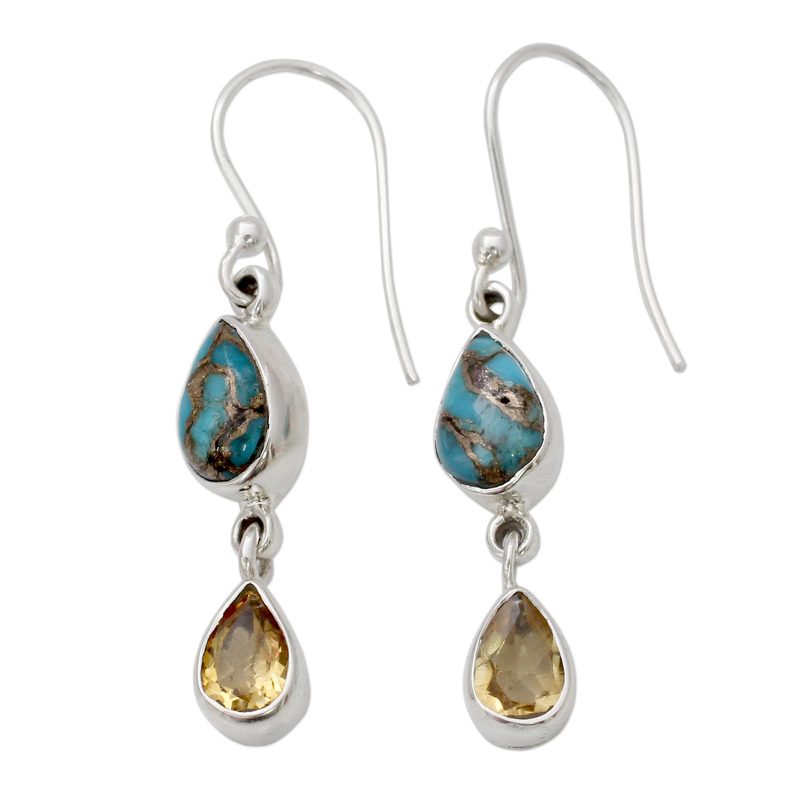 Complementing each other perfectly, teardrops of golden citrine and composite blue turquoise distinguish these earrings from India's Neeru Goel. The earrings are crafted from sterling silver with a gleaming polished finish. They swing from silver hooks.