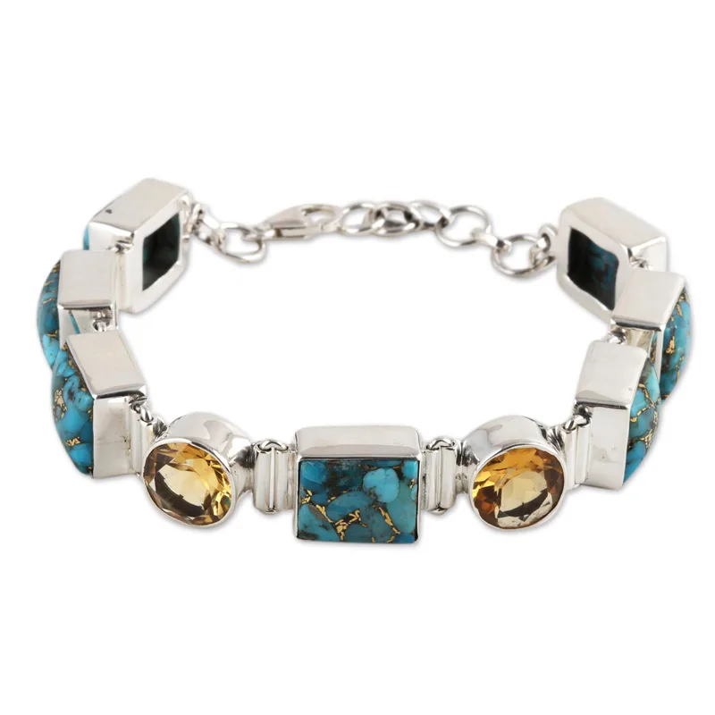 Made for each other, like minds stand out from the crowd. Shanker links two golden moons of faceted citrine with sky blue composite turquoise. The gemstones find a perfect setting in this sterling silver bracelet.