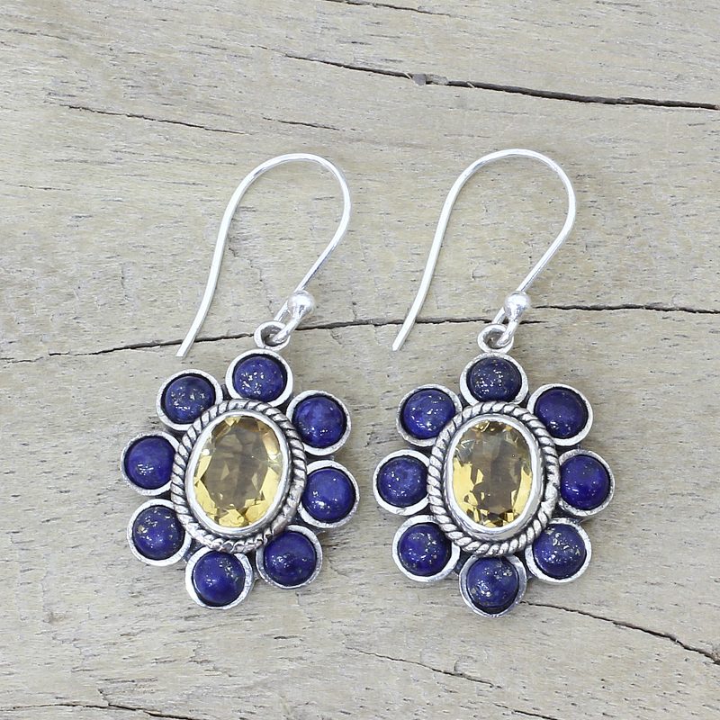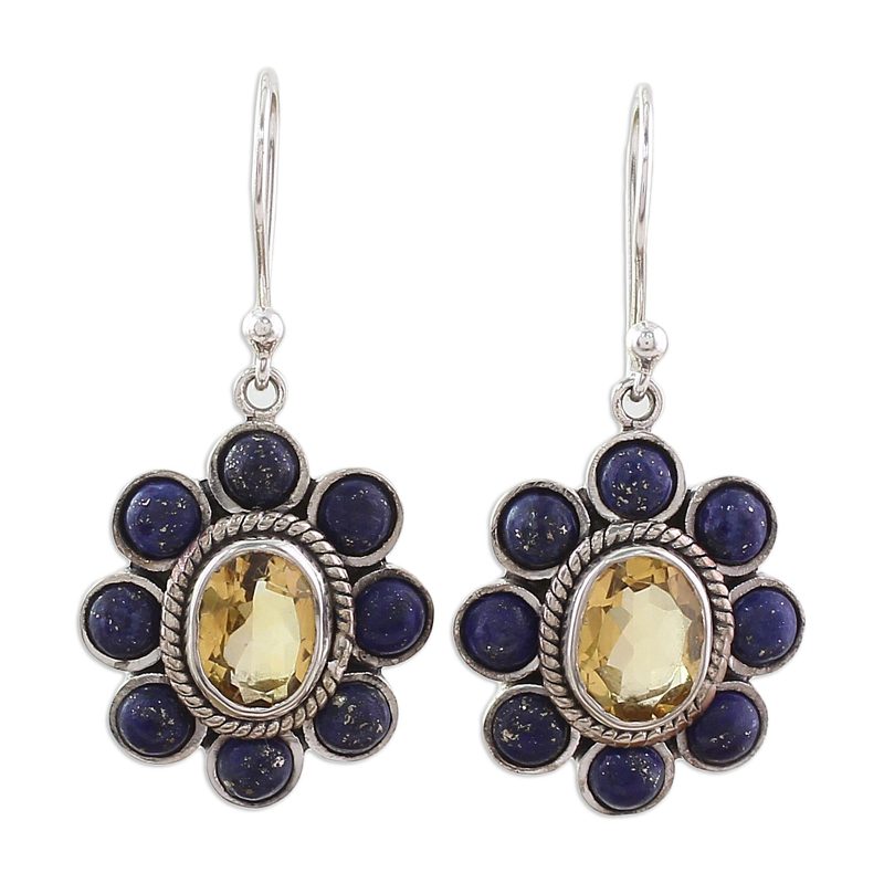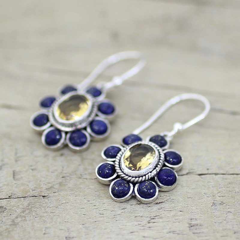 Like the sun shining against a blue sky, radiant citrine sparkles at the center of a lapis lazuli halo. Presented by India's Neeru Goel, these captivating earrings include 5 total carats of citrine set in sterling silver.