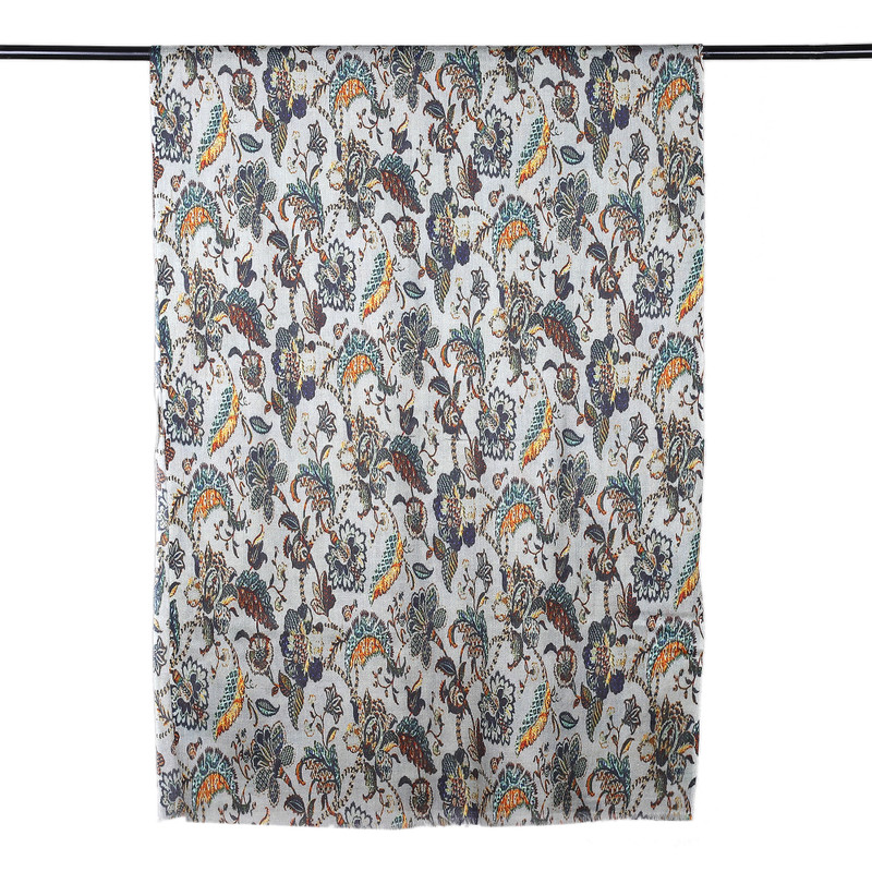 Design is printed on a silky-soft woven wool and silk blend that just floats...a 3-season weight for sure. The colors were richer than those on my monitor: the background a darker blue-green teal (called jade on the accompanying card), with golden, red, orange and navy in the paisley print.